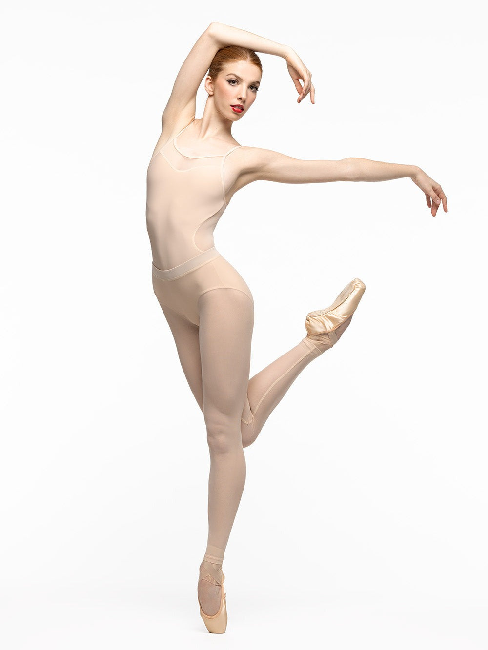 Model 1 is wearing Kira Tights Sand Mesh RTW in size Adult Medium.