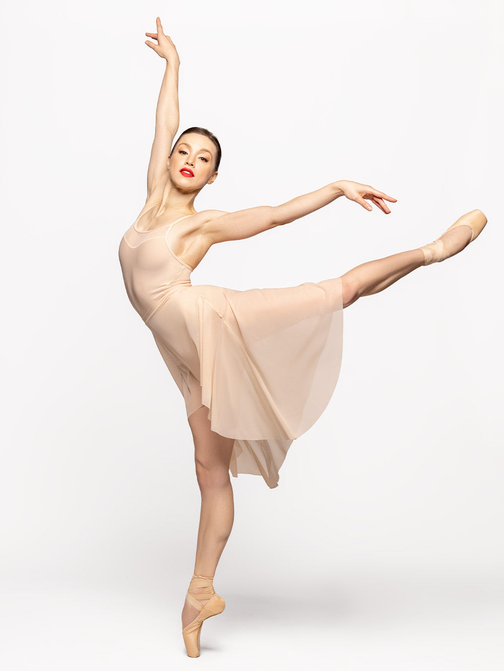 This brilliant skirt style, the Dragonfly, accents any leotard with its divine drape. Now available in Sand Mesh.