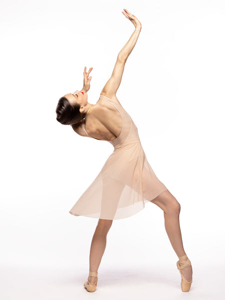 Model is wearing Short Dragonfly Skirt Sand Mesh RTW in size Adult Medium with Maddie Sand Leotard RTW.