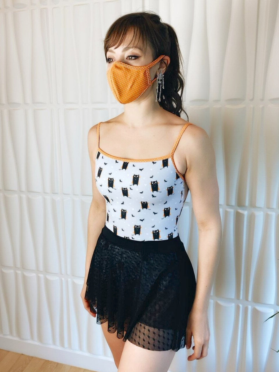 Model 2 is wearing an Aisling Leotard in P-504 Vampire Cats Base with P-499 Orange Dots Trim. Orange Dots Mask sold separately in RTW.