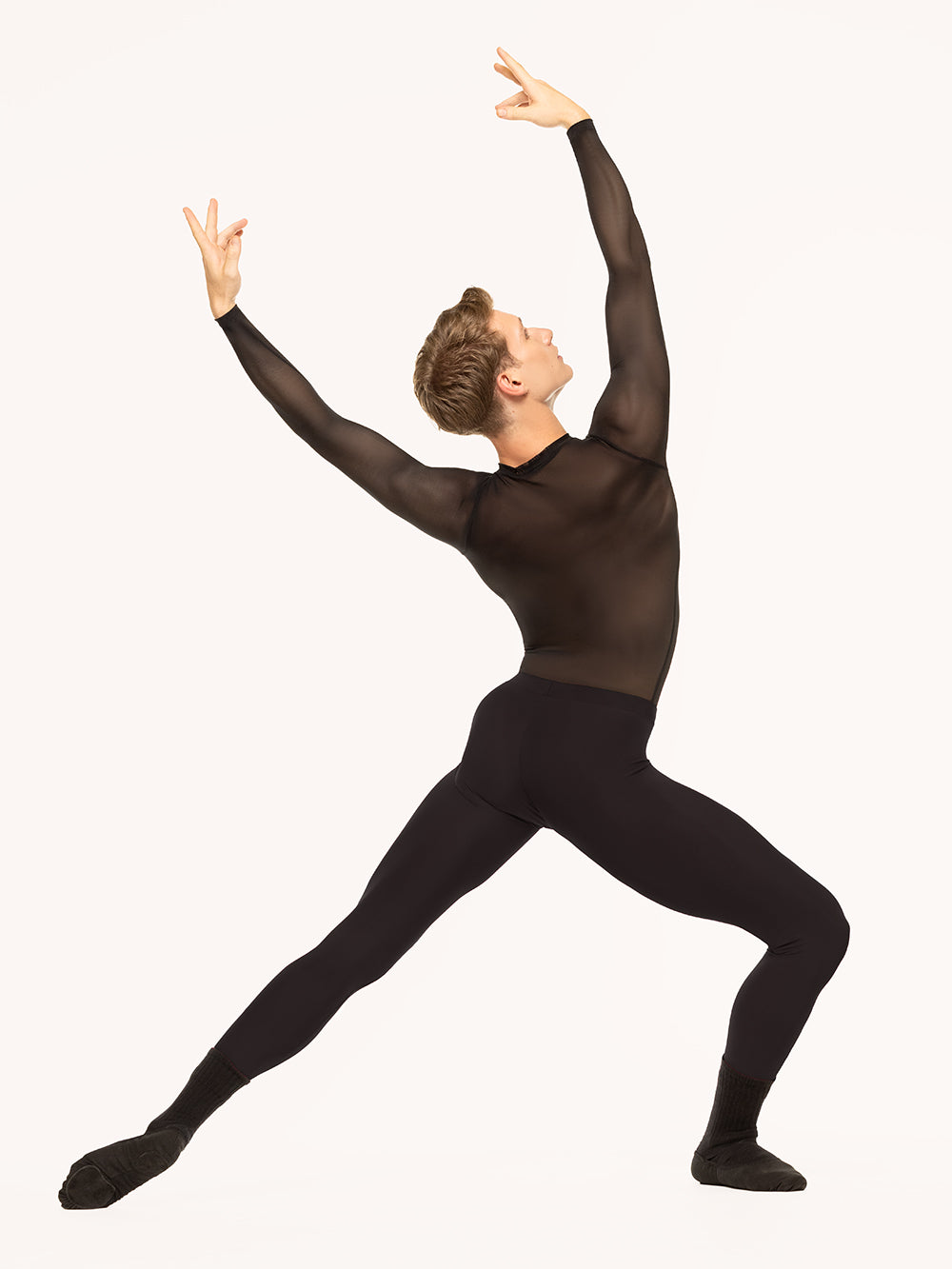 Model 1 is wearing Eric Tights Black RTW in size Adult Small with Gabe Leotard Black Mesh RTW (adult sizes).
