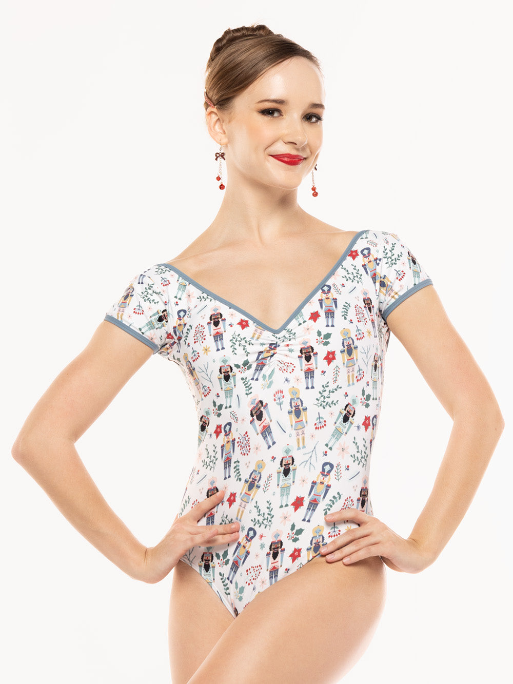 Add a little fun to your holiday rehearsals in our Stella leotard featuring our colorful Nutcracker Parade print and Light Jean trim. This bodysuit has a pinch front, barely over the shoulder sleeve and a low-back design.
