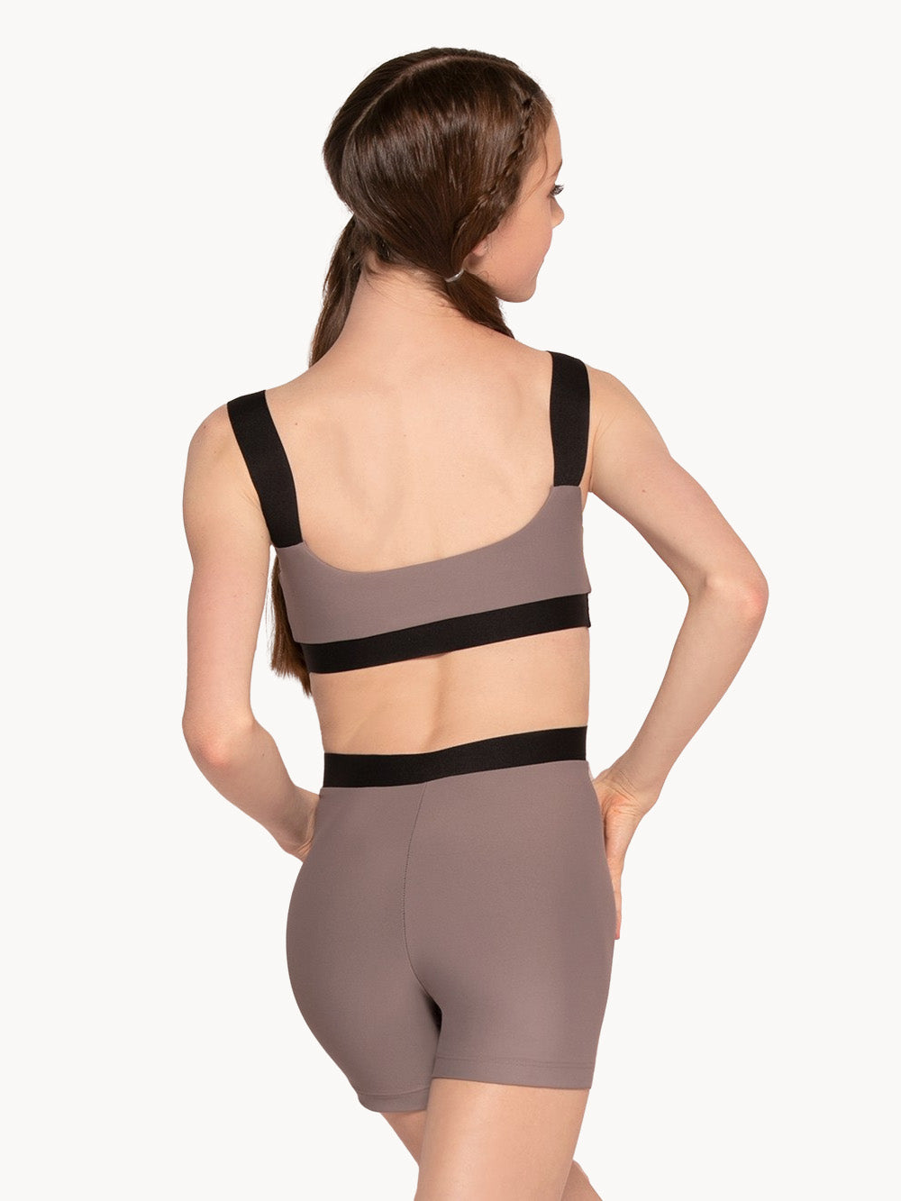 The sporty Vanessa Biketard is so versatile in our soft Truffle fabric. For a touch of contrast, supportive elastic adds a pop of flair to this cutting-edge design.
