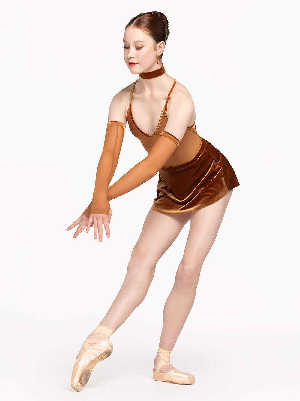 Model 1 is wearing leotard, arm sleeves, and skirt in adult size XS.