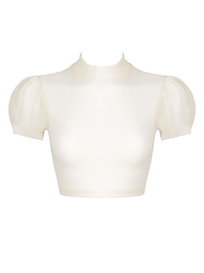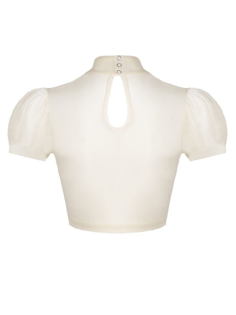 This elegant mesh crop top features delicate puff sleeves, a high mock neckline, and a subtle keyhole back closure. This design adds a romantic, ethereal touch—perfect for layering under or over a leotard or solid crop top. Light, breathable, and effortlessly chic, it brings a dreamy finish to any outfit.