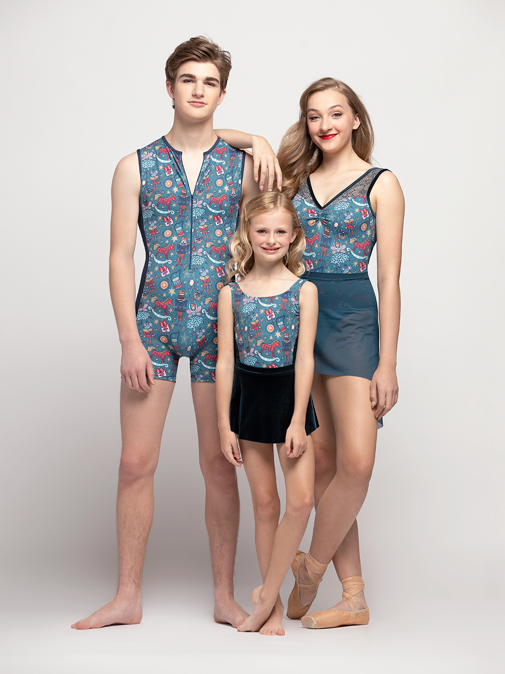 Our new Nathan Biketard with side stripes debuts this season in our festive Nutcracker print. To complement the print, the look features Midnight Matte side stripes, trim, and zipper.