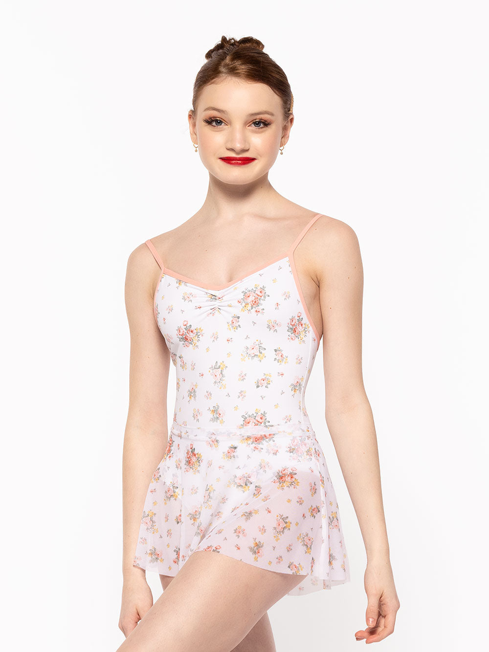 Simple and stunning, our Nolte Leotard features a darling cami strap with a charming front pinch. Adorned in the whimsical floral Summer Breeze print and topped with Blossom Matte Trim this effortless style is a must have. Complete the look with our matching Flare Skirt Summer Breeze Mesh Kids RTW.