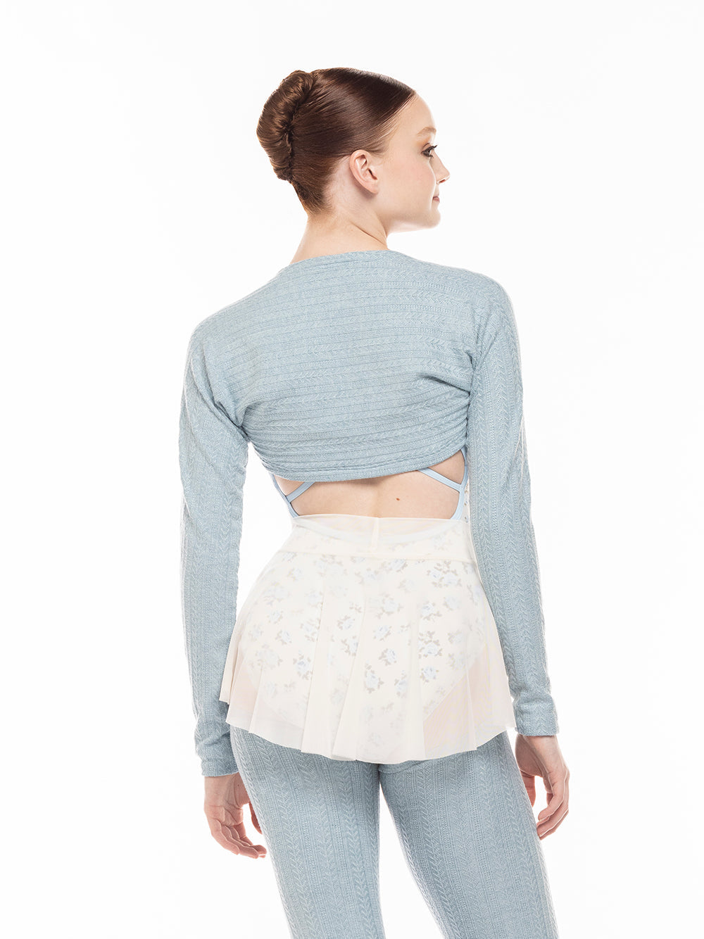 Model 1 is wearing a leotard and skirt in adult size XS and knits in adult size XS/S.