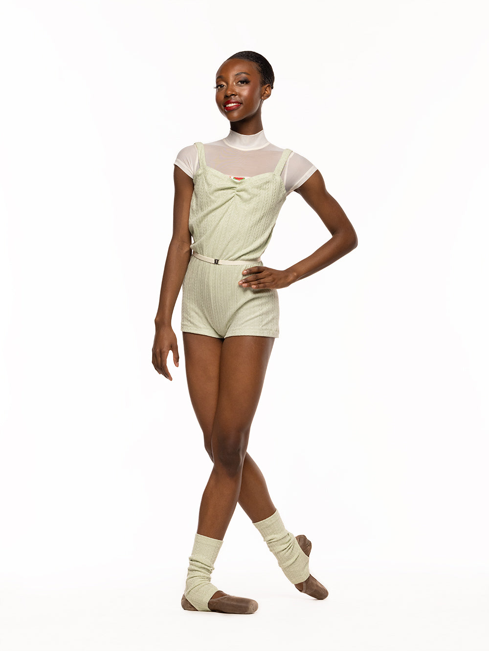 Model is wearing Ankle Warmers and Shrug in size Adult XS/S, and Knit Biketard and Leotard in size Adult XS.