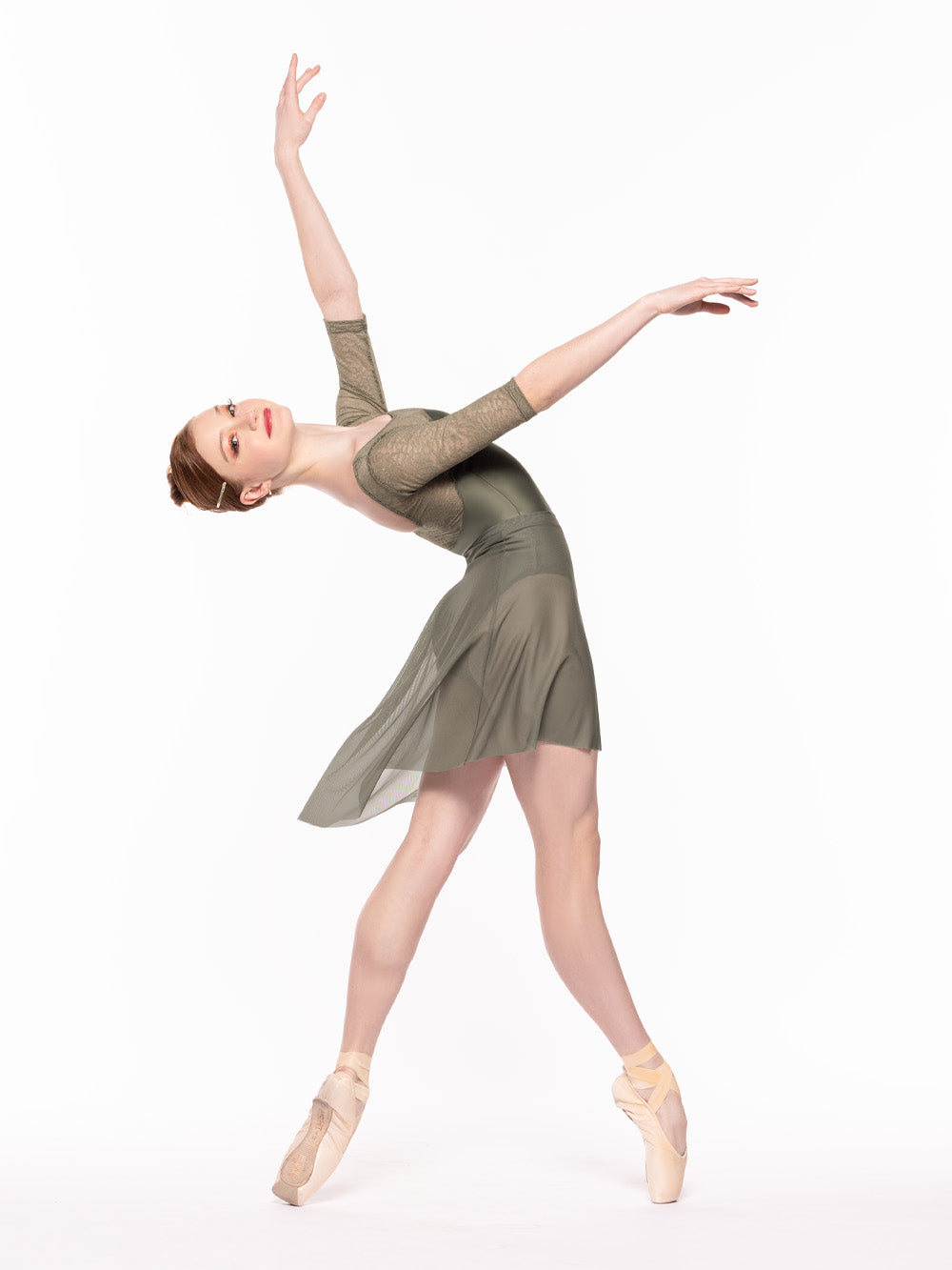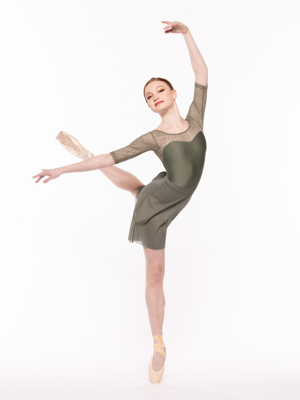 Model is wearing Vinzant Leotard Dusty Olive Zinnia Lace Kids RTW in size Child Large with Vienna Short Wrap Skirt Dusty Olive Lace Kids RTW and Back Tuck Skirt Dusty Olive Mesh Kids RTW.