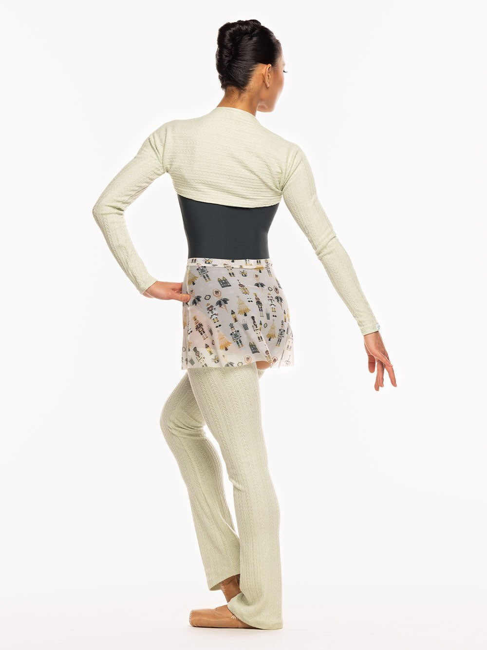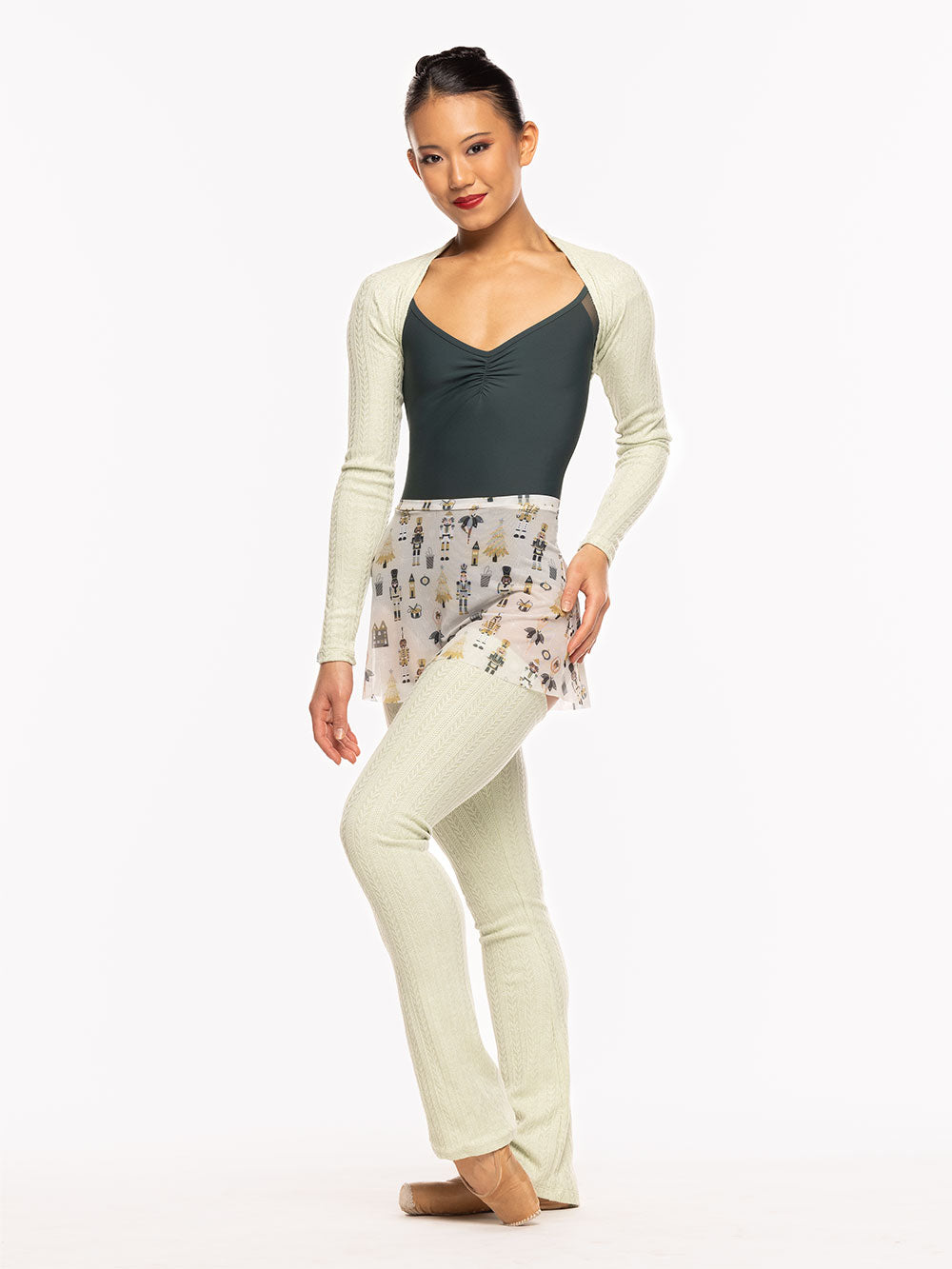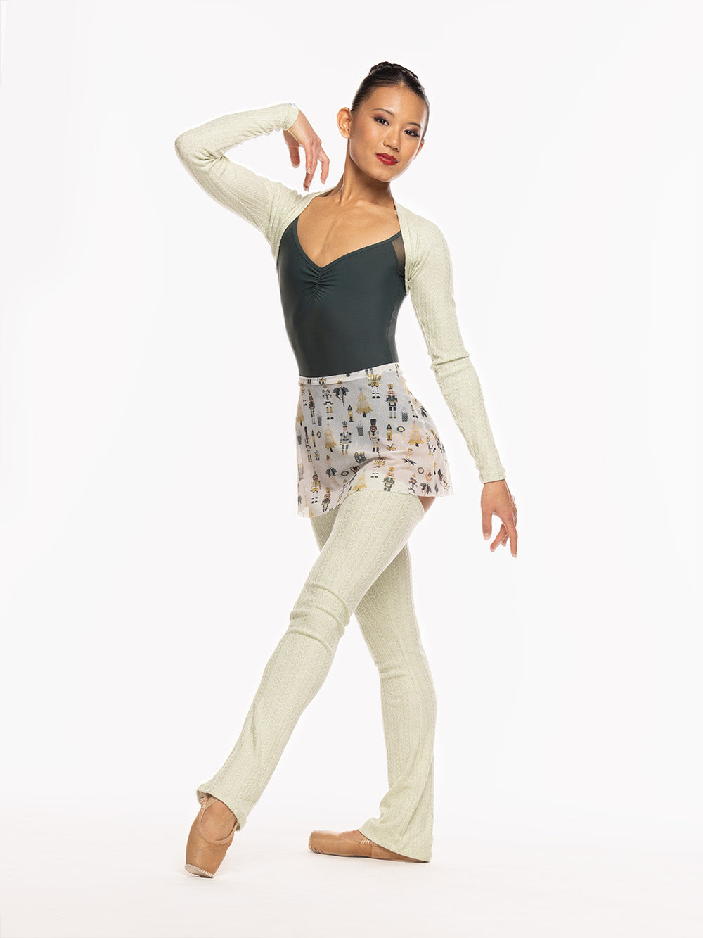 Model is wearing skirt and leotard in size Adult S, with Shrug and Thigh High Leg Warmers in size XS/S.