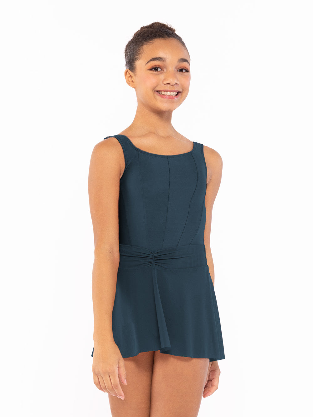 Model is wearing Diana Leotard Deep Sea Kids RTW in size Child Medium with the Amora Skirt Deep Sea Mesh Kids RTW.