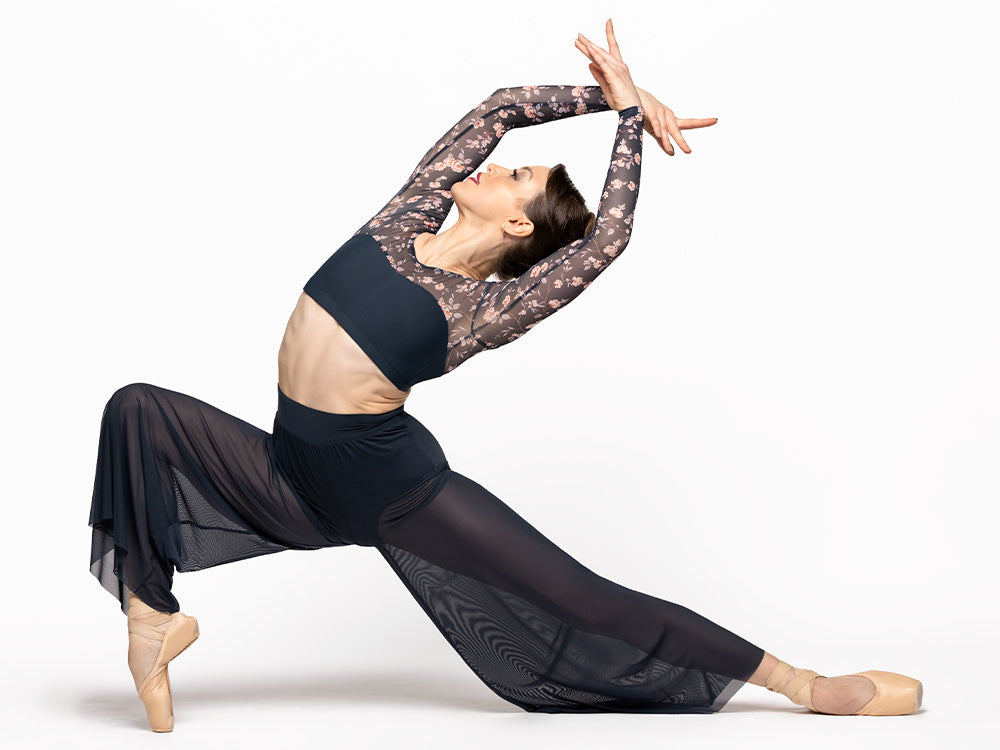 Model is wearing Dana High-Rise Briefs Dark Storm Kids RTW in size Adult Medium with Laico Crop Top Flourish Storm RTW and A-Line Pants Dark Storm Mesh Kids RTW.