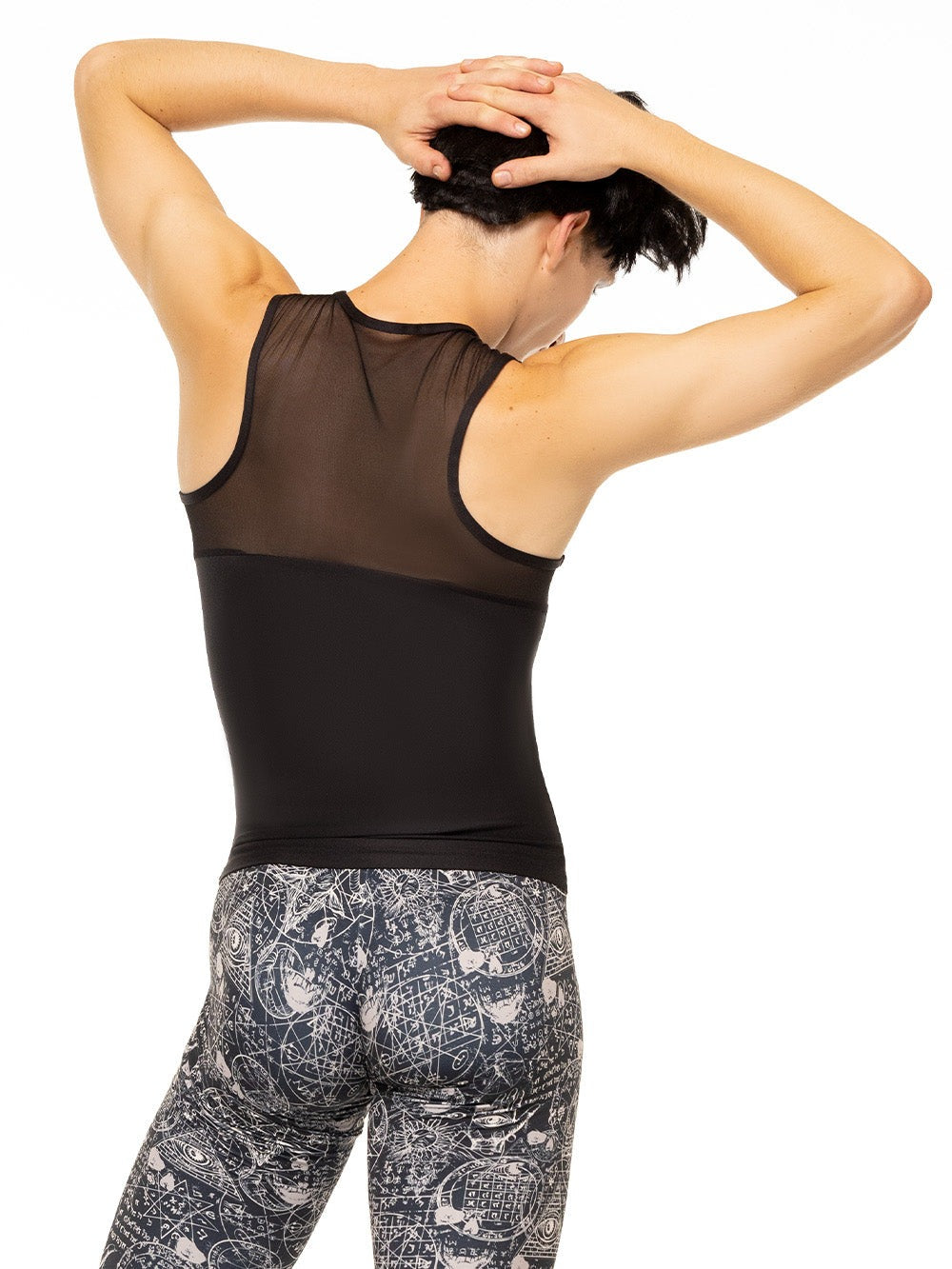Add this timeless staple to your dance wardrobe. Our Lateef Shirt in Soft Black is essential with its Black Mesh front side panels that wrap into a wide racerback.
