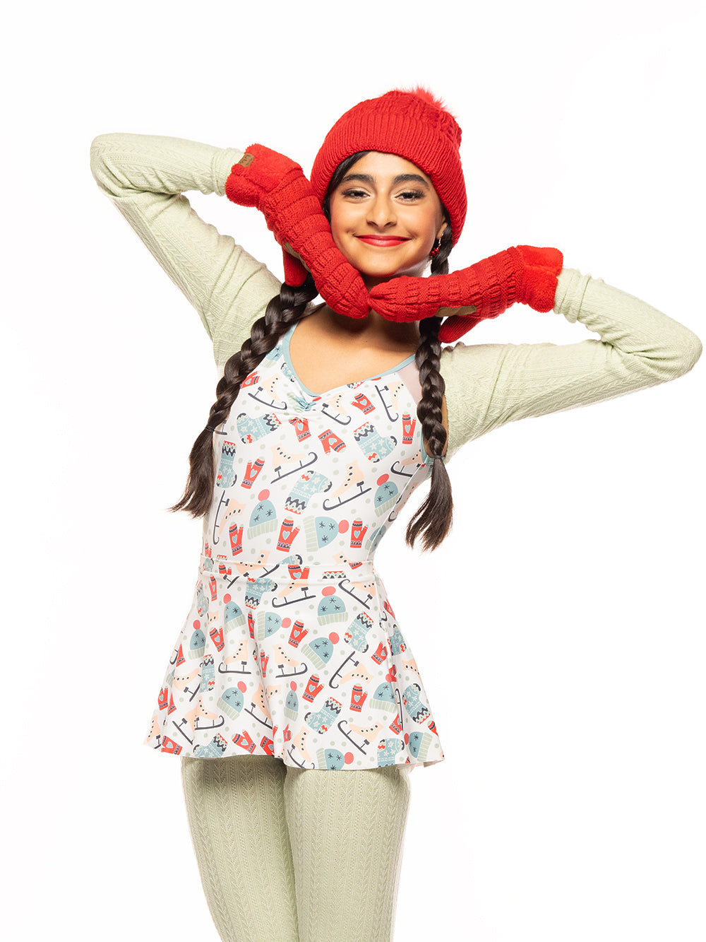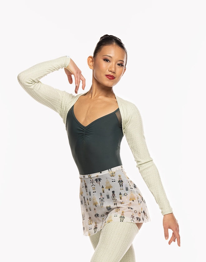 Model is wearing Shrug and Leg Warmers in size Adult XS/S, and Leotard and Skirt in size Adult XS.