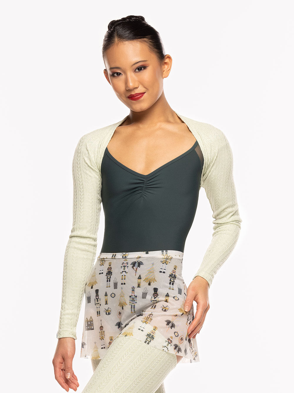 Model is wearing Shrug and Leg Warmers in size Adult XS/S, and Leotard and Skirt in size Adult S.