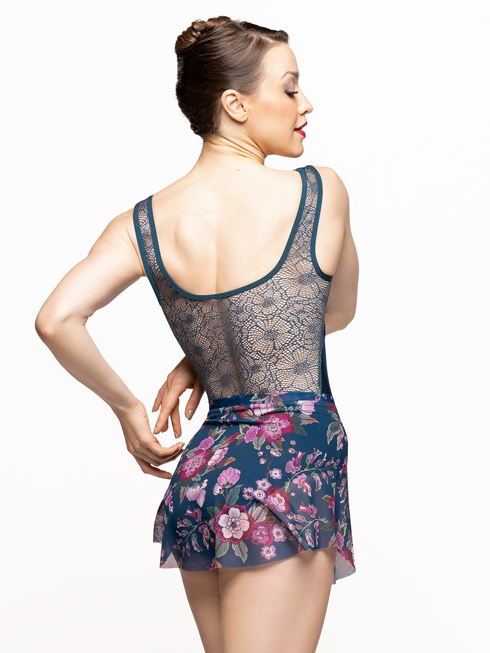 Model is wearing Tulip Skirt Aspire Mesh RTW in size Adult Small with Fabiola Deep Sea Lace RTW.