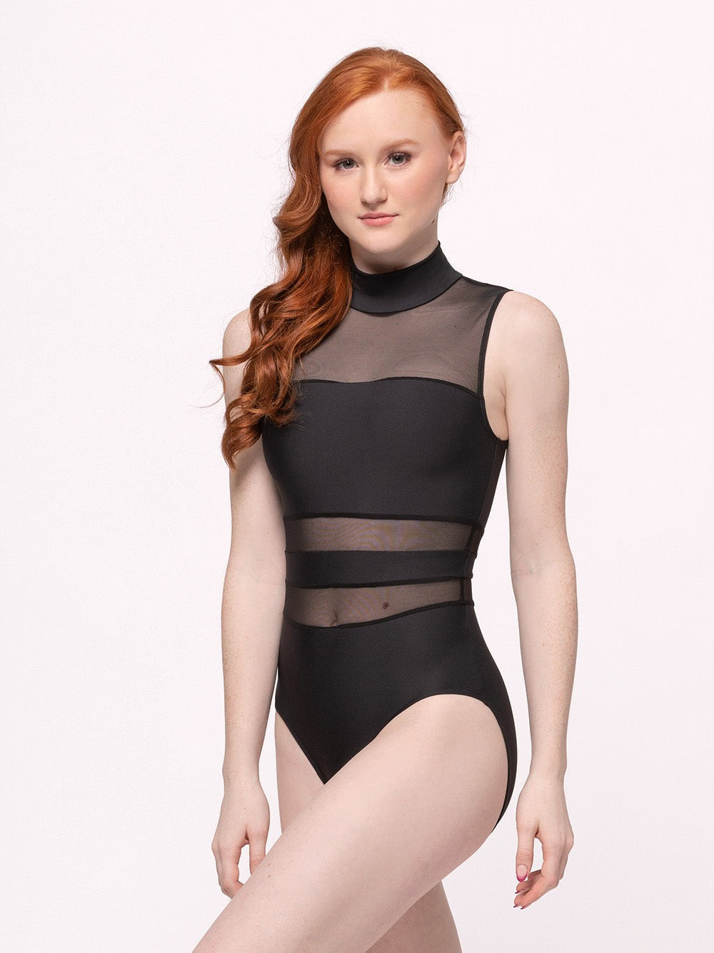 This leotard is the perfect mix of solid and mesh to give you that edgy look you want in the studio or on the stage. Now available in a sleeveless classic soft black with black mesh!