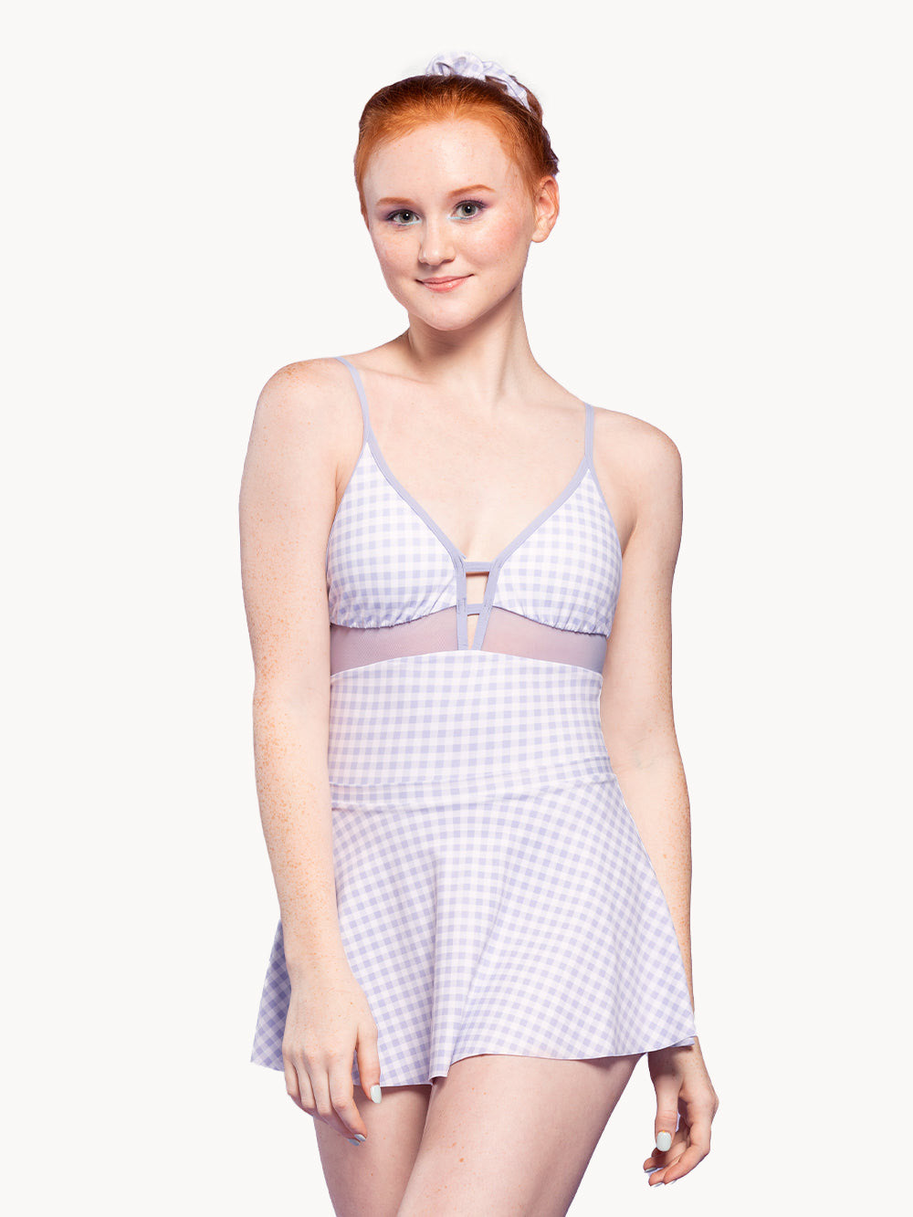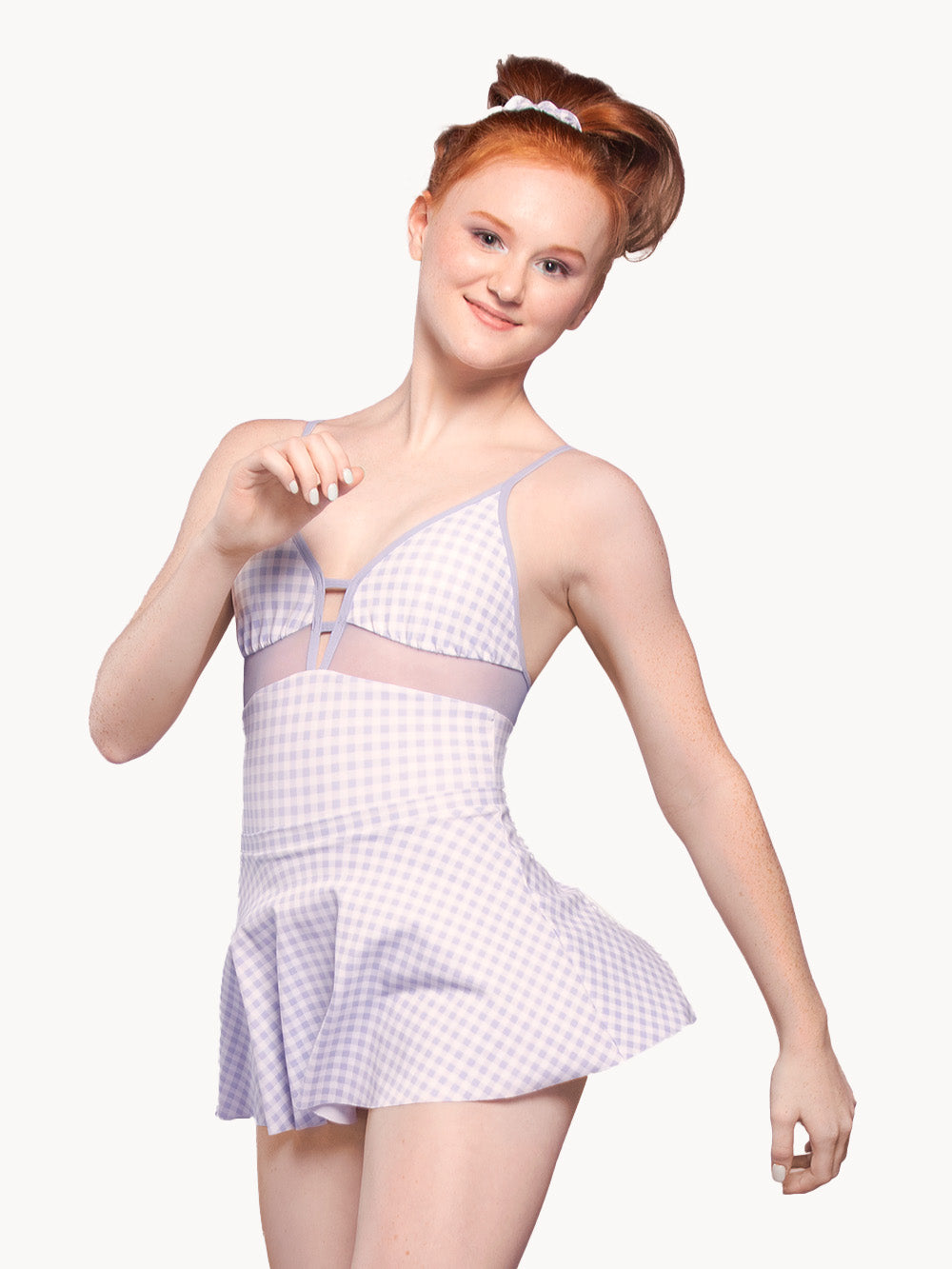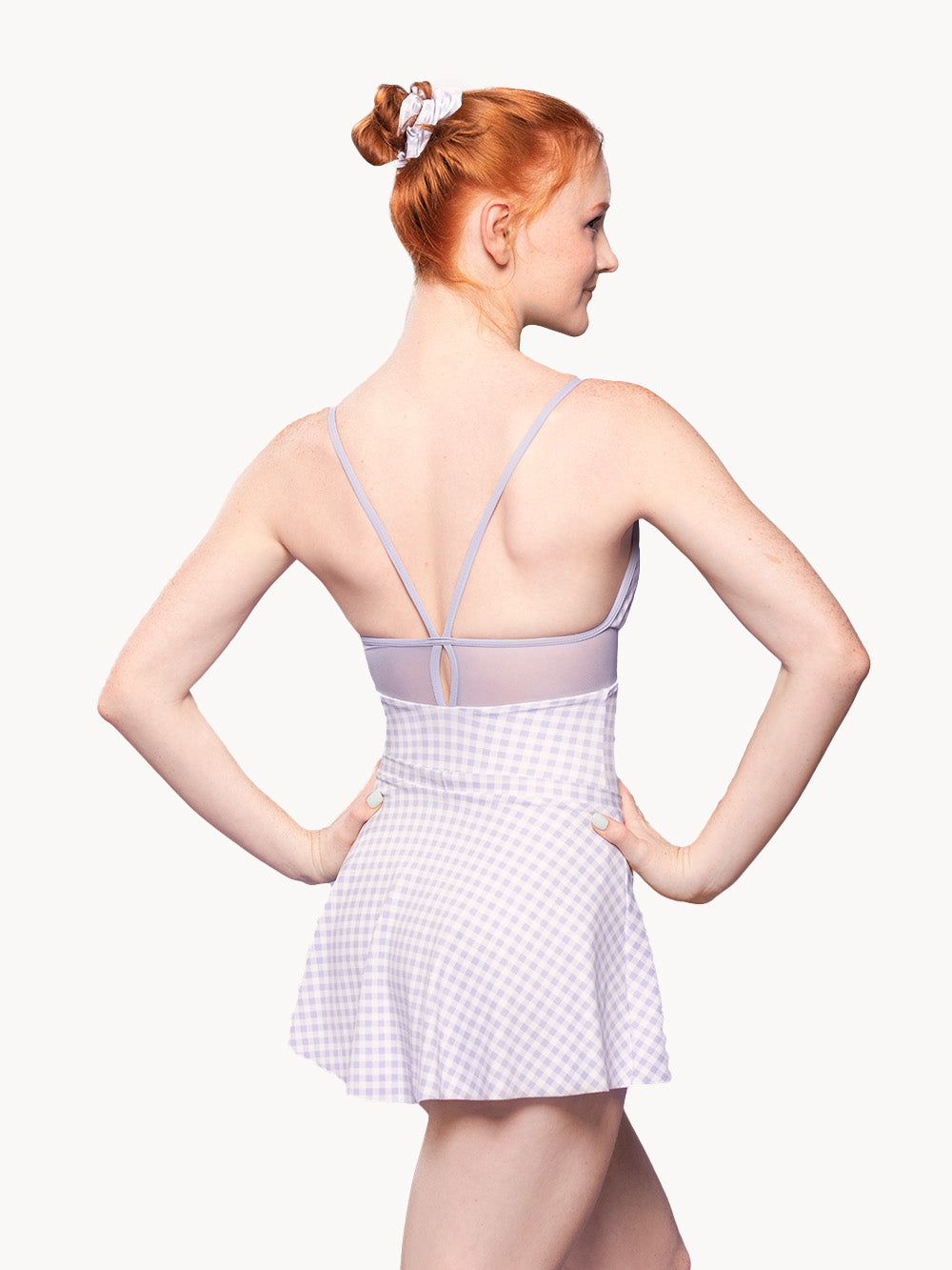 Ready for some warm weather fun? The adorable Agnes Leotard in picnic ready Lavender Gingham is sure to turn a few heads with mesh cutouts and strappy v-back details. Pair with a matching Flare Skirt Lavender Gingham RTW or Tulip Skirt Lavender Mesh RTW, and Lavender Gingham Scrunchie RTW.