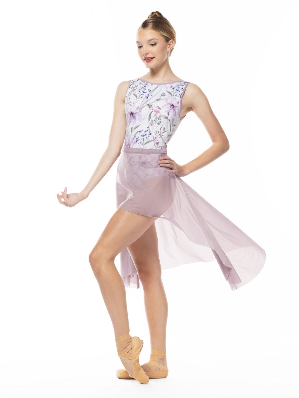 Model 1 is wearing Short Dragonfly Skirt Nirvana Mesh Kids RTW in size Adult X-Small with Theresa Leotard Flourish Haze RTW.