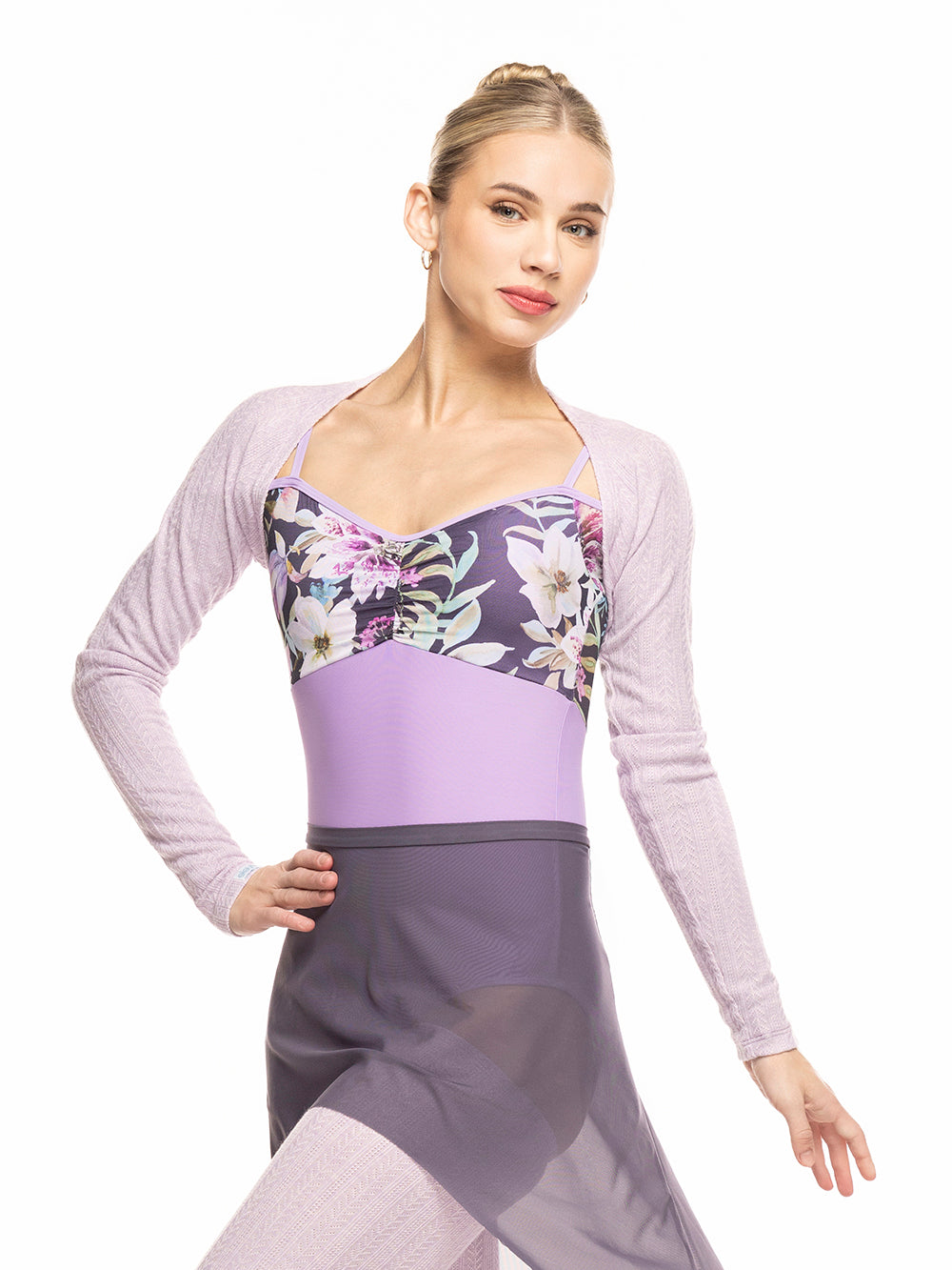 Model is wearing Shrug and Thigh High Leg Warmers in size Adult XS/S, and Skirt and Leotard in size Adult S.