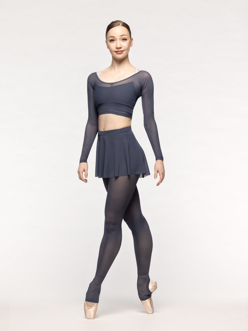 Model 2 is wearing crop tops, skirt, and tights in size Adult Small.