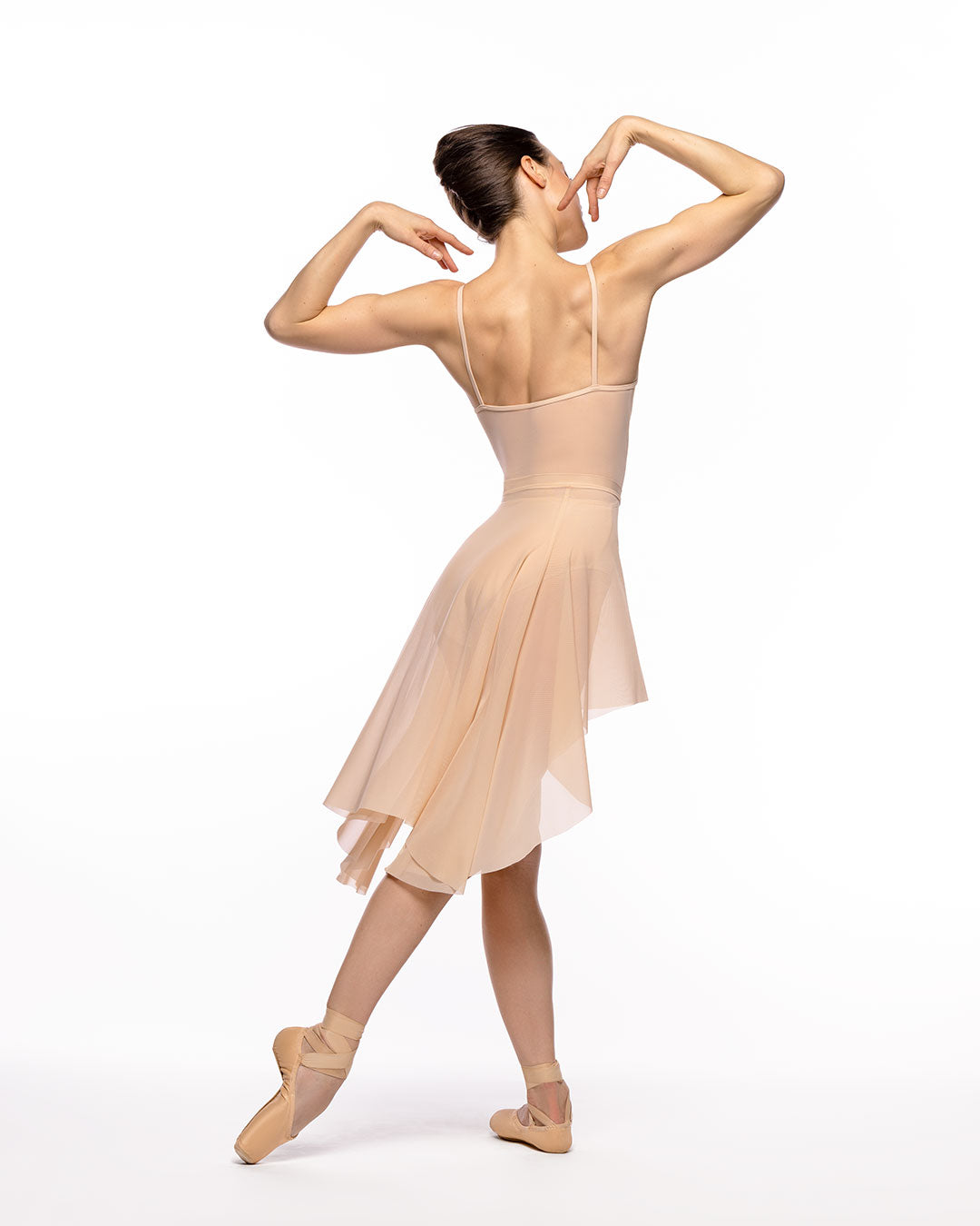 Model 1 is wearing Maddie Sand Leotard RTW in size Adult Medium with Short Dragonfly Skirt Sand Mesh RTW.