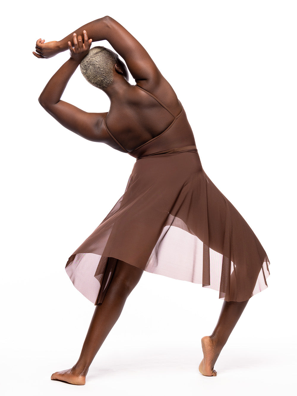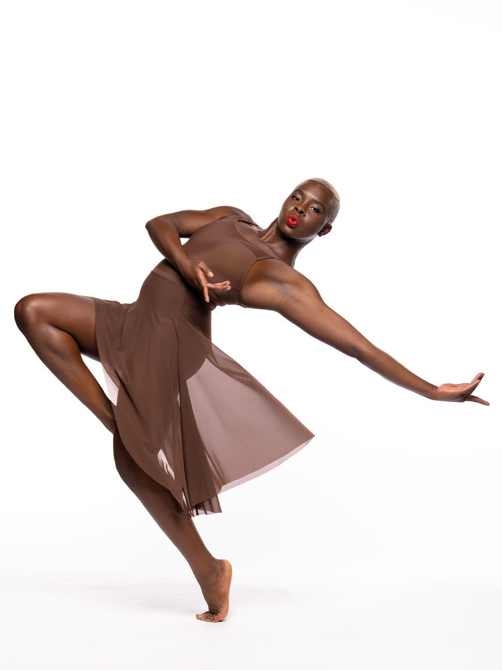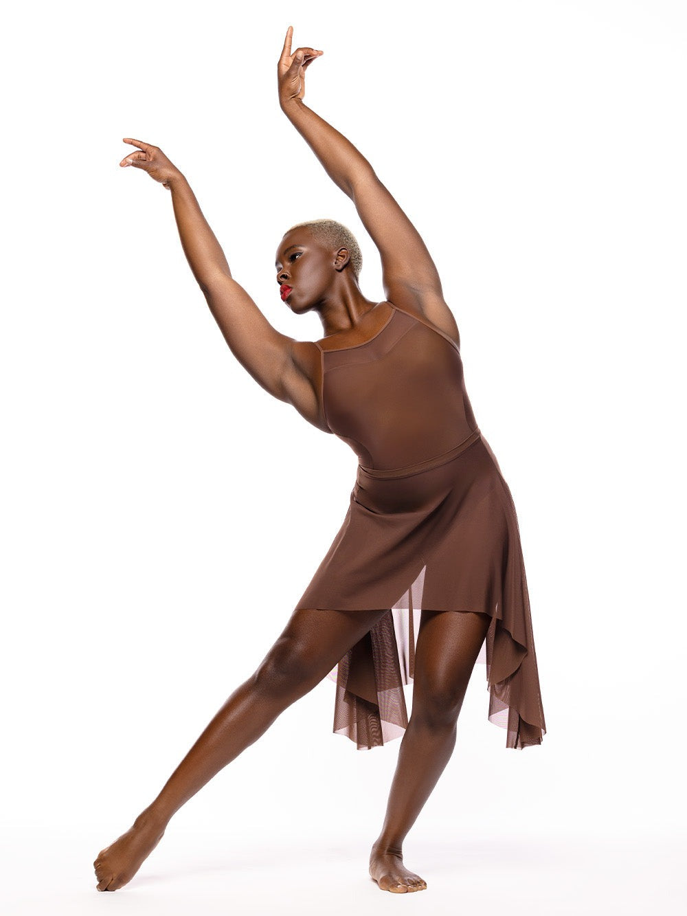 Model is wearing Short Dragonfly Skirt Coffee Mesh RTW in size Adult Large with Maddie Coffee Leotard RTW.
