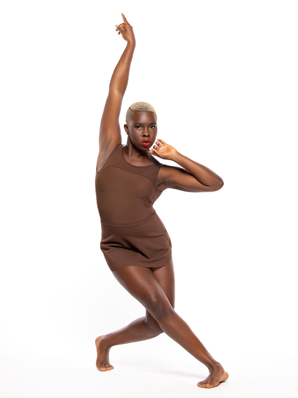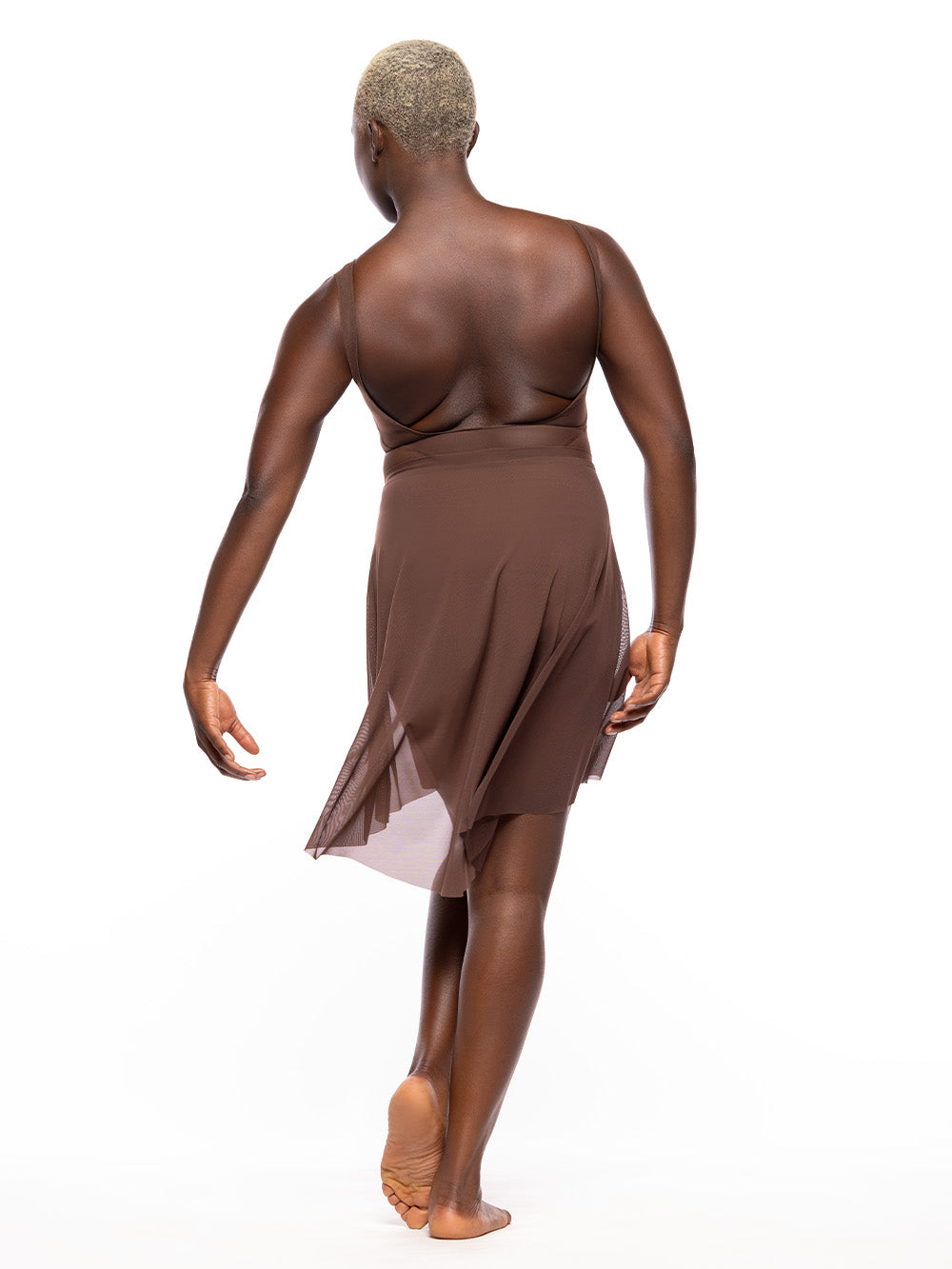 Model is wearing Victoria Coffee Leotard in size Adult Large with Long High-Low Skirt Coffee Mesh RTW and Tulip Skirt Coffee Mesh RTW.