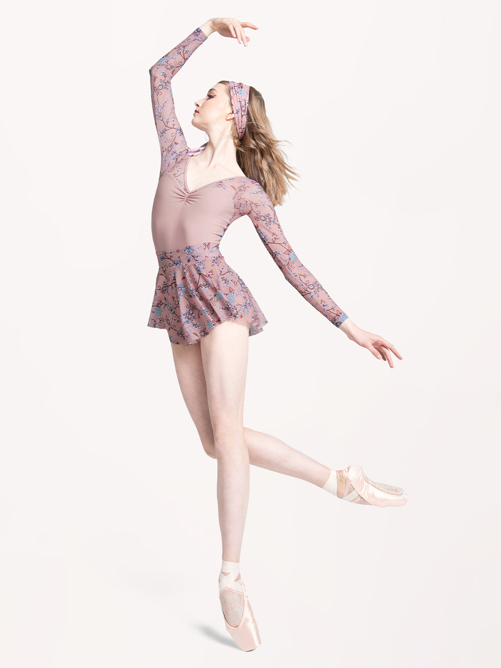 This full circle, low rise skirt style will help accentuate your lines or add movement to any performance piece. Our Hipster Skirt is now available in Crescendo Pink Mesh in a dusty rose hue. We've paired it here with the Fabiola Crescendo Pink RTW.