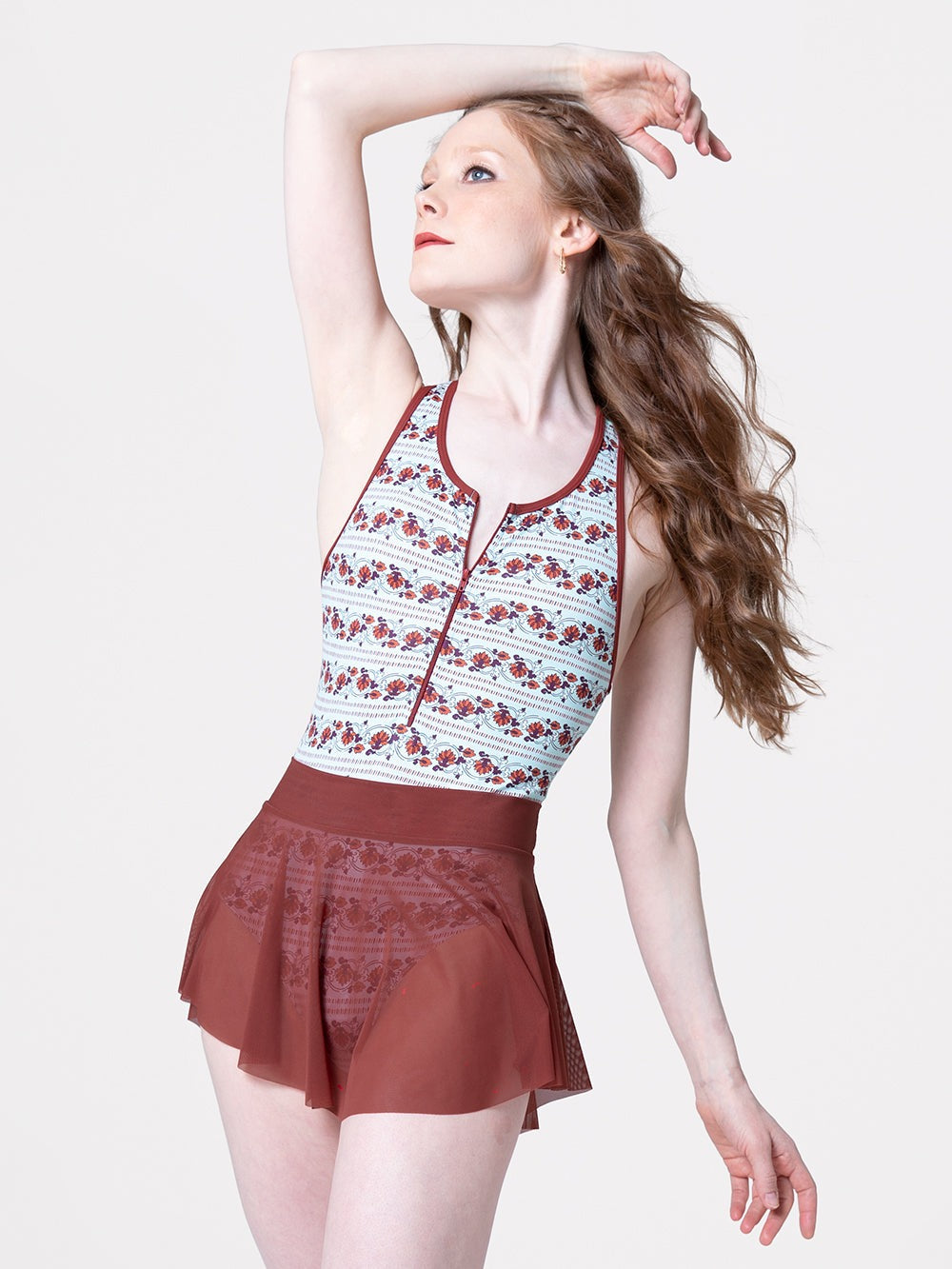 This full circle, low rise skirt style silhouette with a wide waistband will help accentuate your lines or add movement to any performance piece. Our Hipster Skirt is now available in Mars Mesh. We've paired it here with Tina Leotard Mars RTW and Laura Leotard Azila RTW.