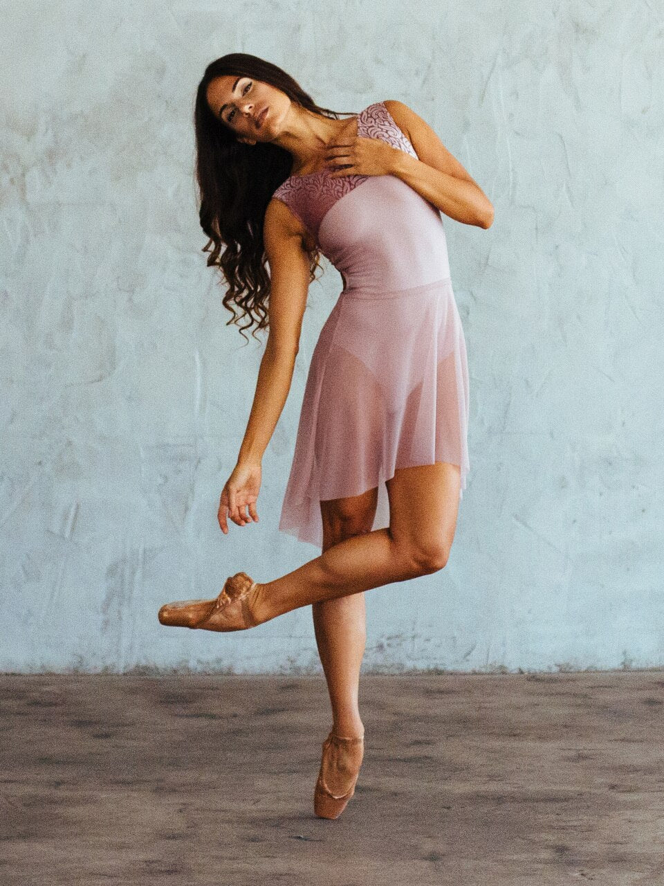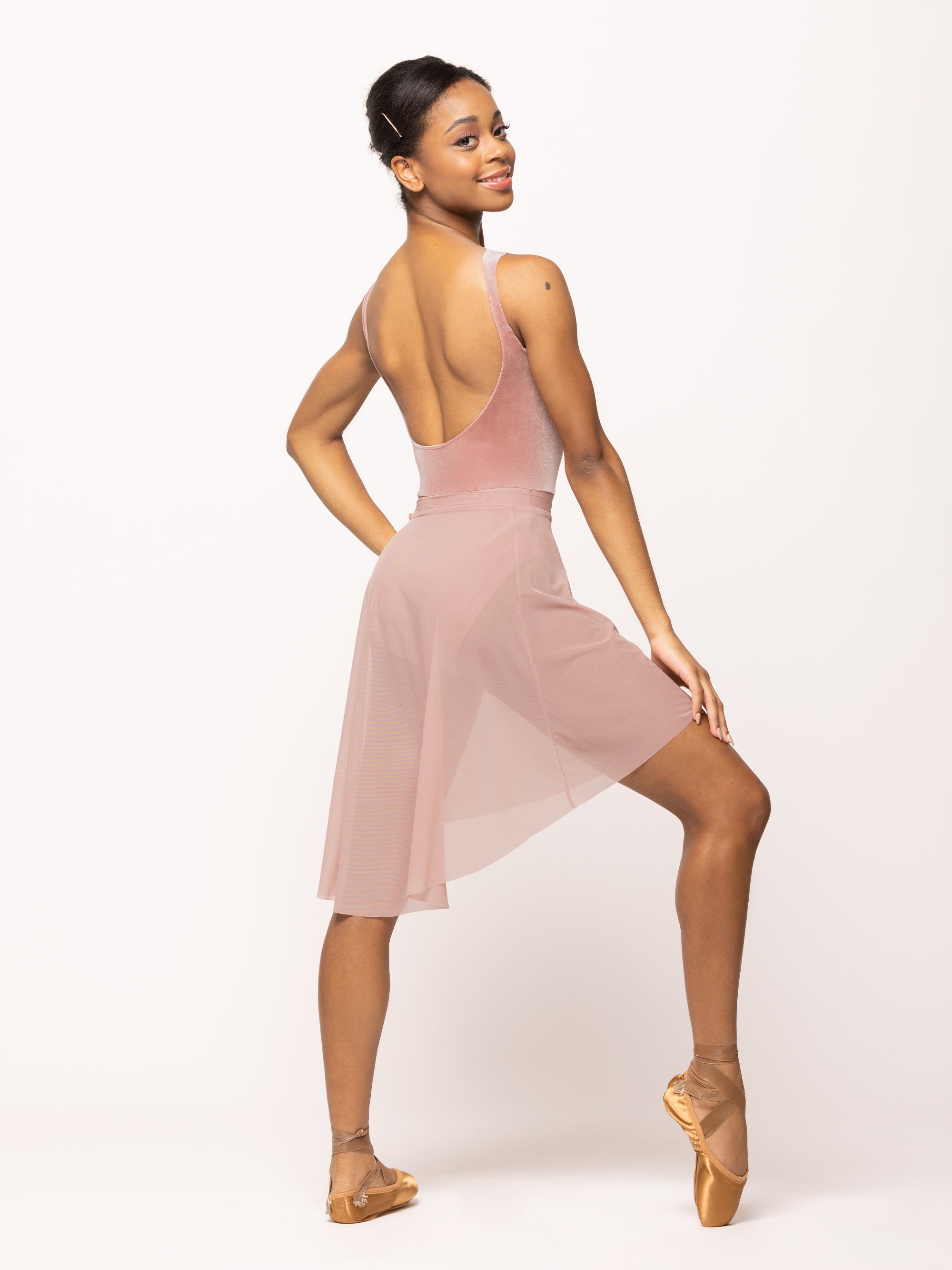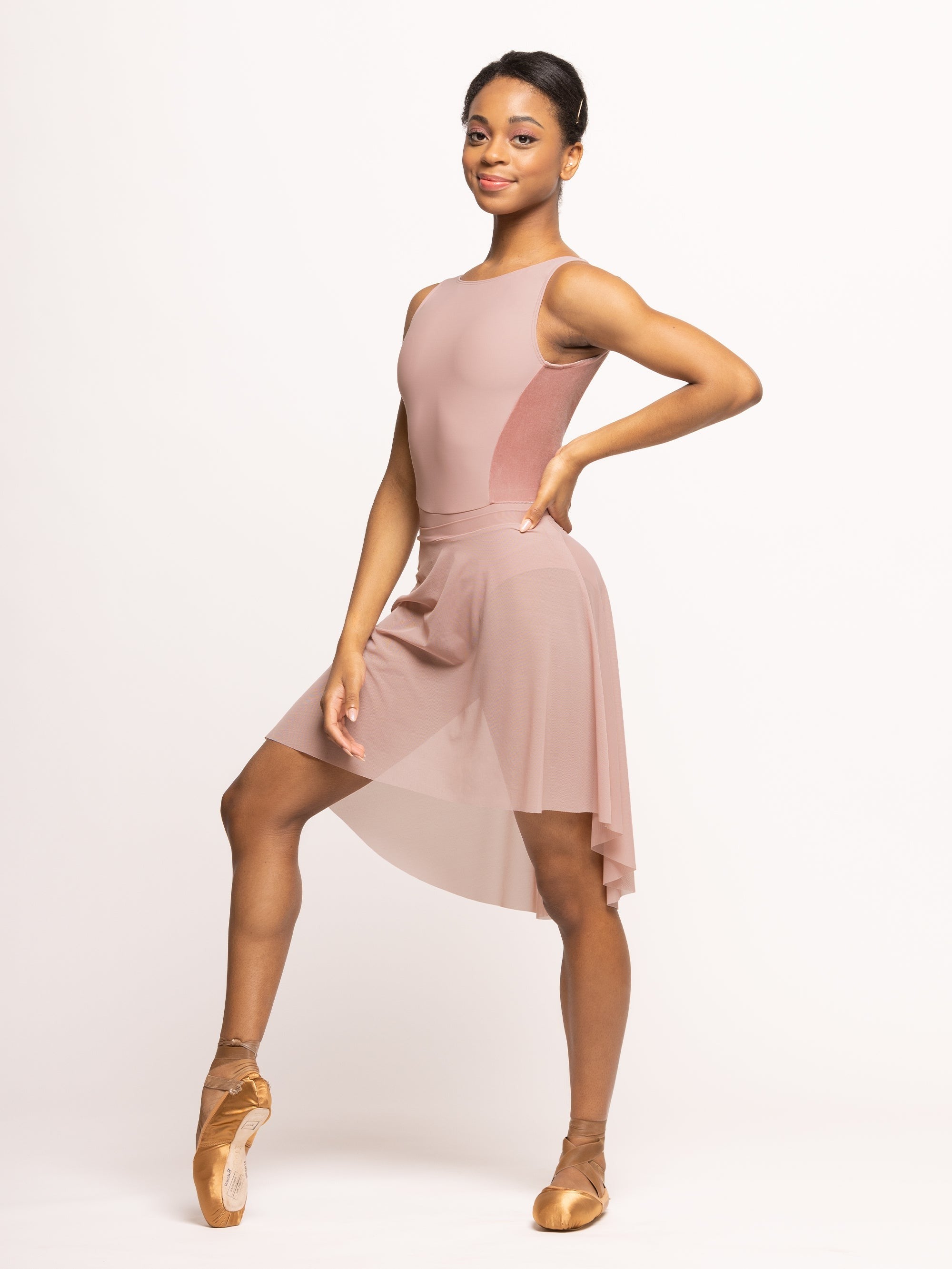 Model 2 is wearing the Dusty Rose Mesh Long High-Low Skirt with the Charlotte Dusty Rose RTW.