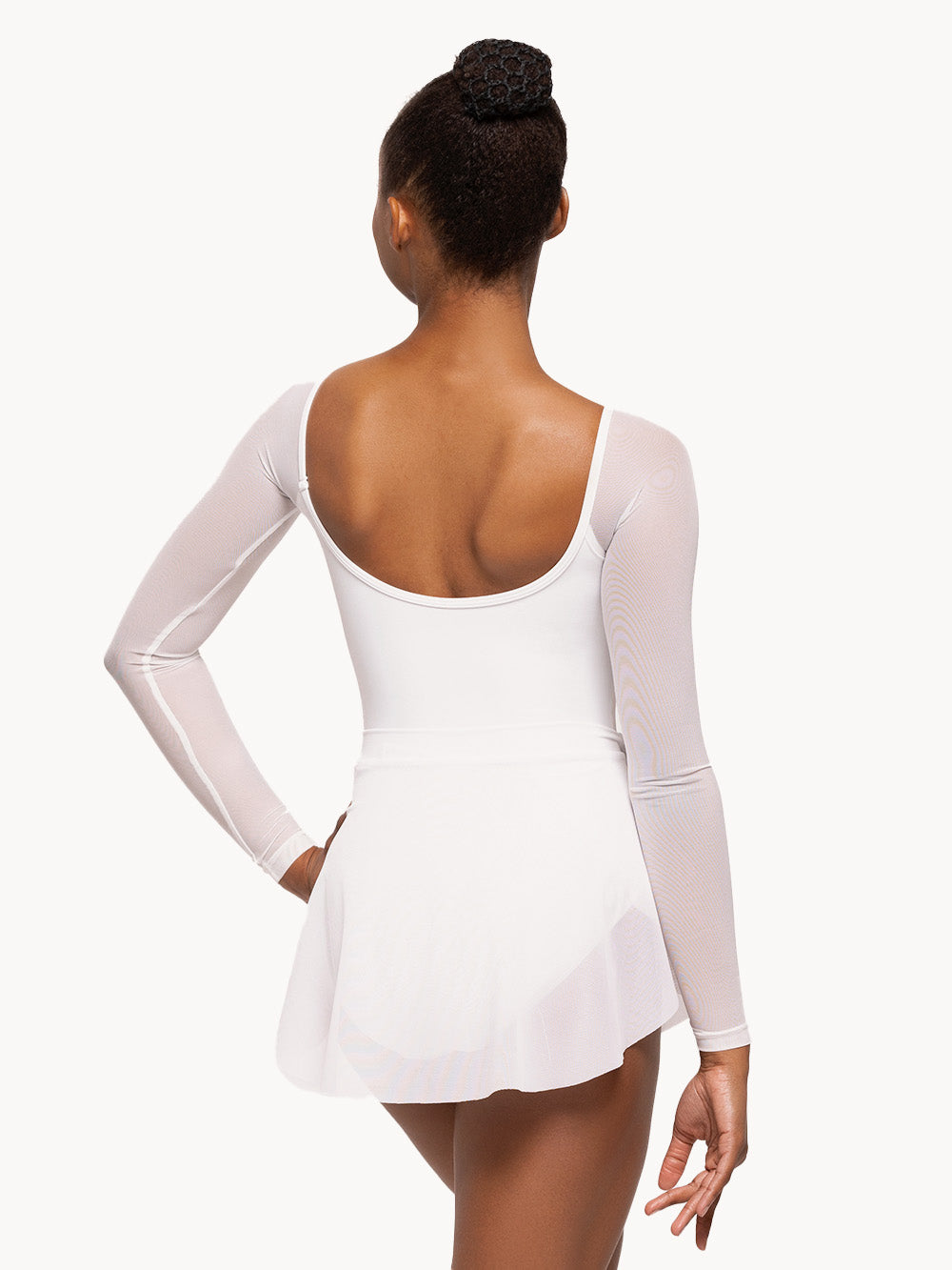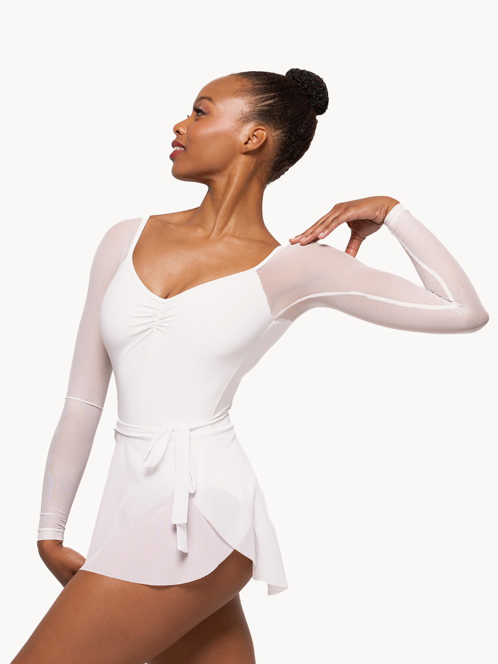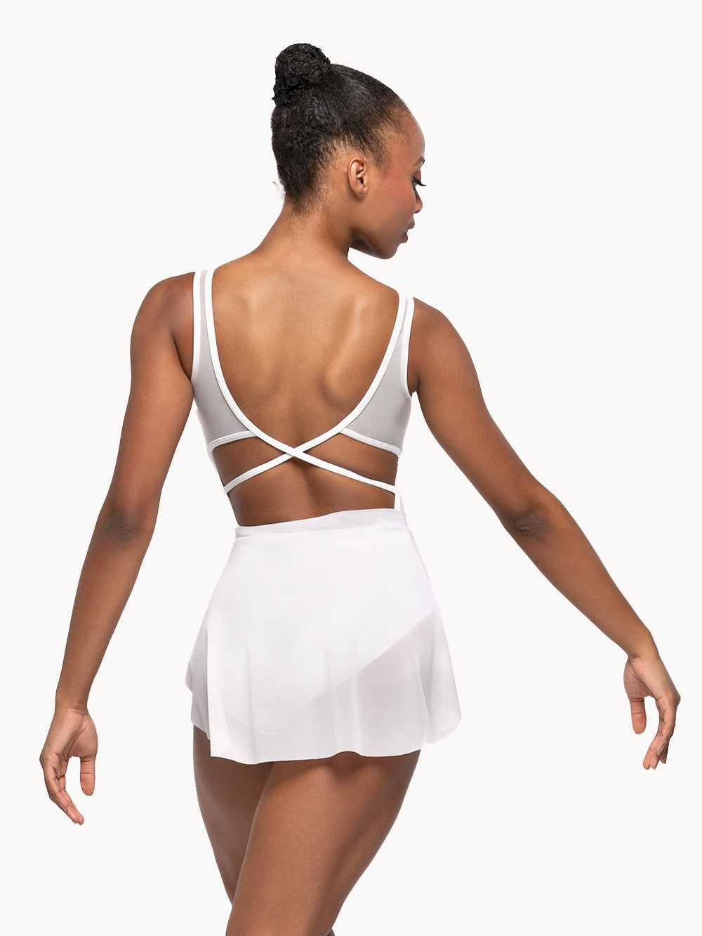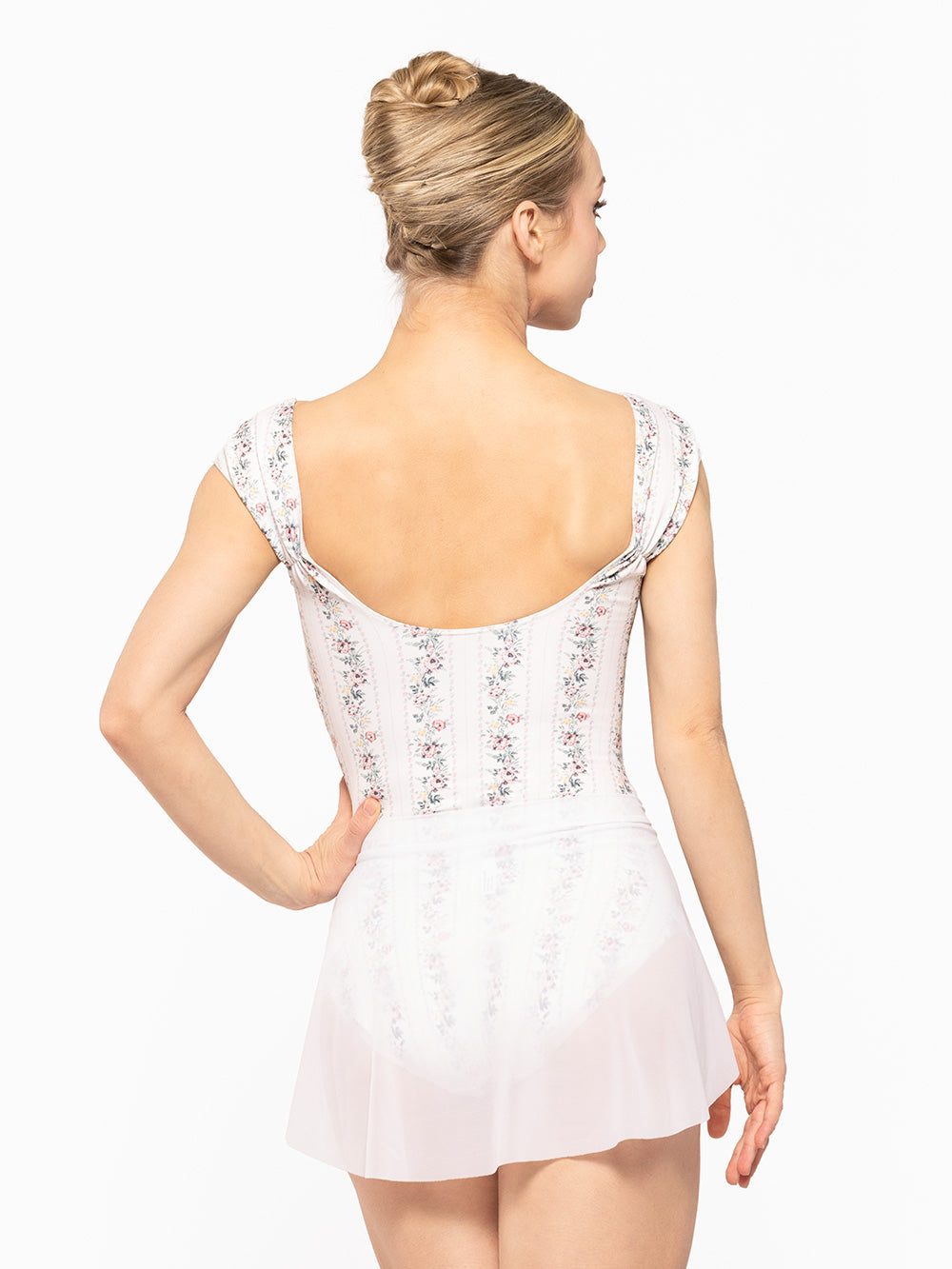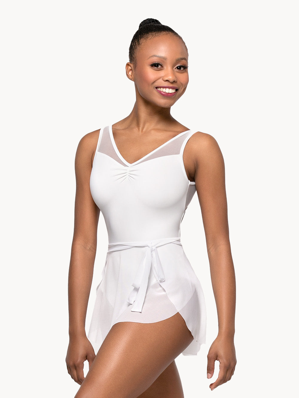 Model 1 is wearing Angelina Leotard Delightful RTW with Petal Skirt White Mesh RTW in size Adult Small.