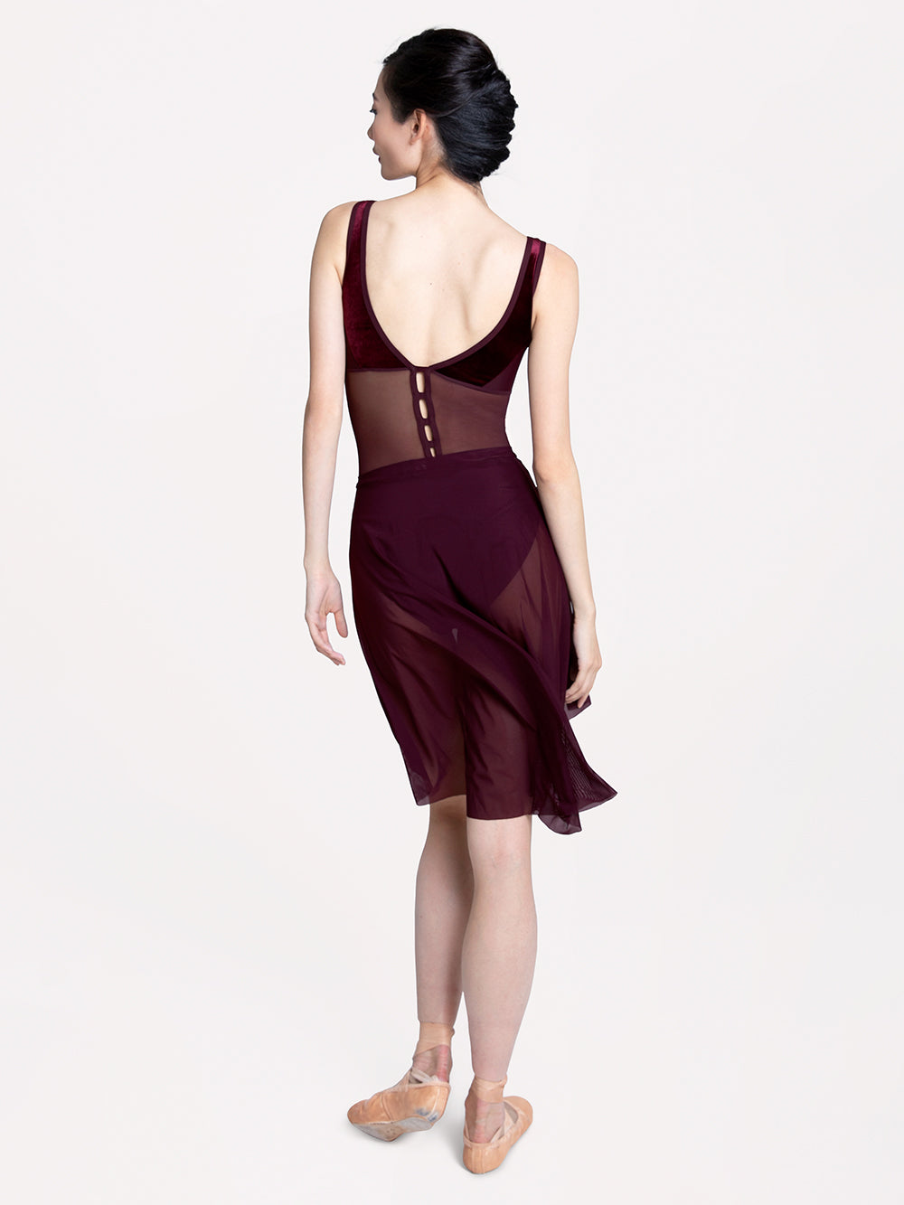 The Sholeh Sangria gives you a touch of flair with a Sangria mesh waist and matching velvet details around the neckline, Sangria matte base, and top panels. The front and back feature laddered elements. Leotard Cut on this style features a slightly higher leg line than our standard Leotard Cut. Try pairing with the Long High-Low Skirt Sangria Mesh RTW.