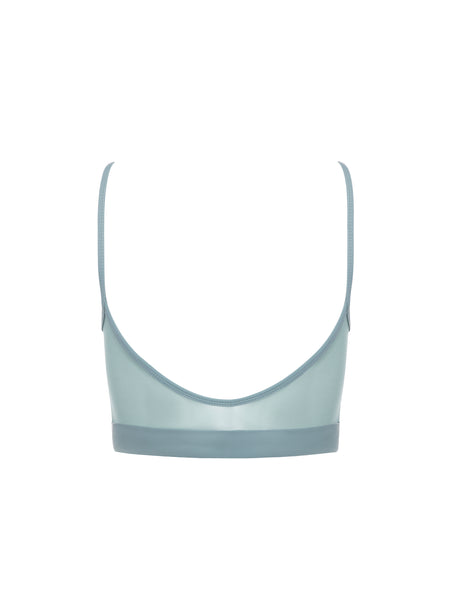 - Model is wearing VEL-C-40.6 Frozen Lagoon Crushed Velvet Top Front and Trim with M-40.6 Lagoon Mesh Front V Panel, Back, and To the Wrist Sleeves paired with our Lana Shorts.