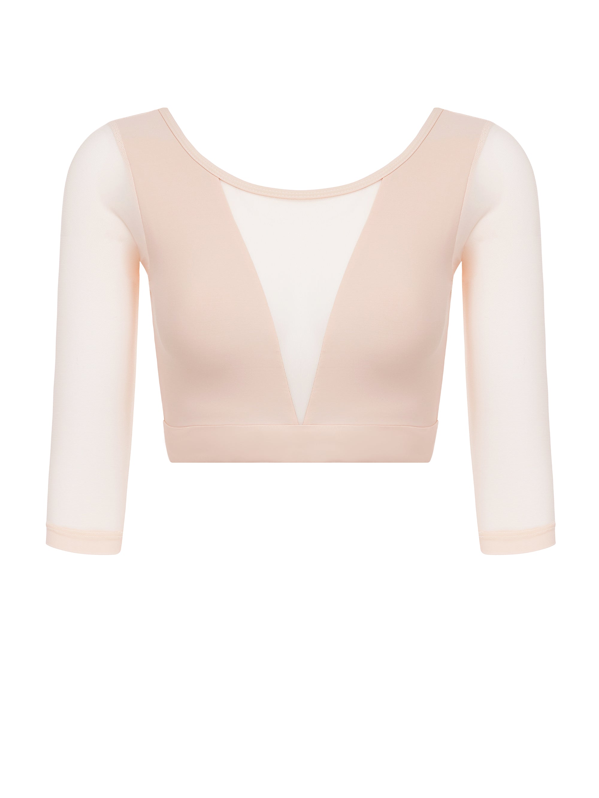 Modernize your dance wear with our updated Brooke with Sleeves Crop Top. This high front style has a beautiful front V panel.