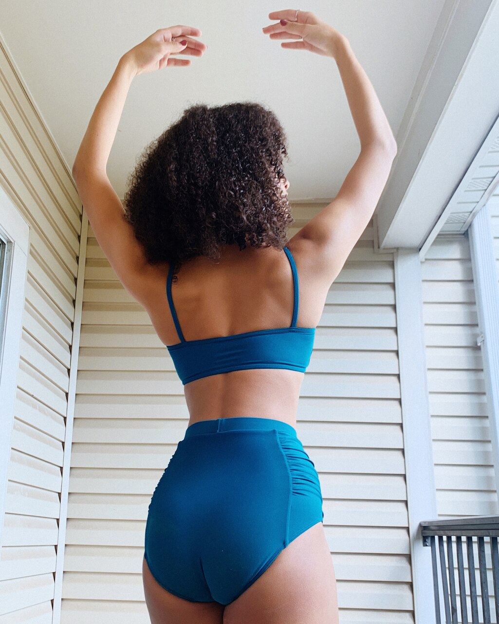 - Model is wearing S-40.5 Deep Emerald Matte Top Front, Top Back, and Trim paired with our High Waisted Gathered Briefs.