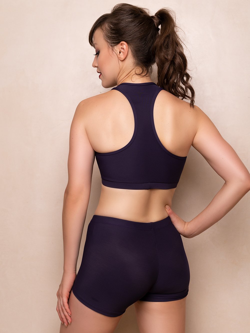 - Model is wearing the Shelley Racerback Crop Top Dark Plum RTW in Soft-24.6 Dark Plum Top Front, Back, Band, and Trim. Matching Lana Shorts Dark Plum RTW sold separately.