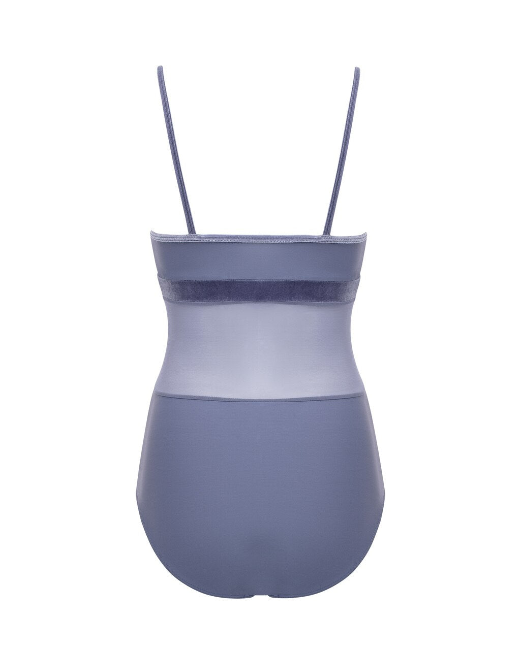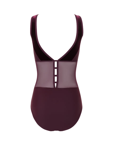 Sample is wearing S-26.1 Wisteria Matte Base and Top Front and Back with VEL-26.1 Wisteria Velvet Middle Stripe and Trim, and M-26.1 Wisteria Mesh Middle Front & Back.