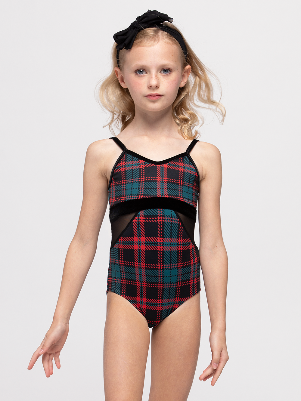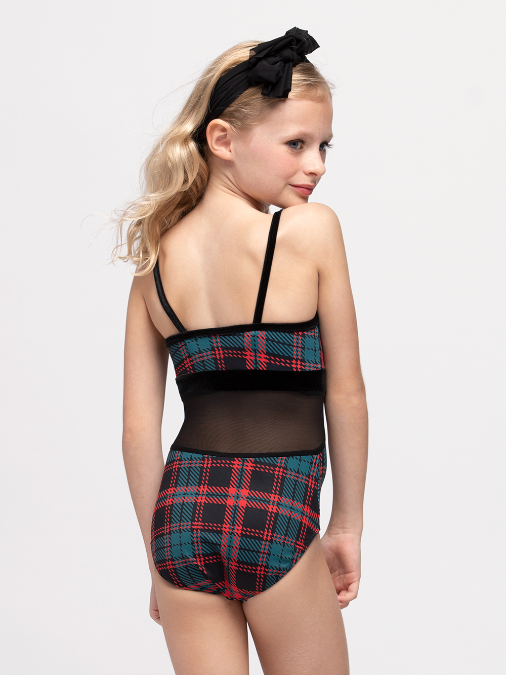 • Model 2 is wearing Ariel Kids Holiday Plaid RTW featuring P-543 Holiday Plaid Top Front & Back and Base, with VEL-59 Black Velvet Middle Stripe and Trim with M-59 Black Mesh Middle Front & Back and Black Mesh Headscarf.