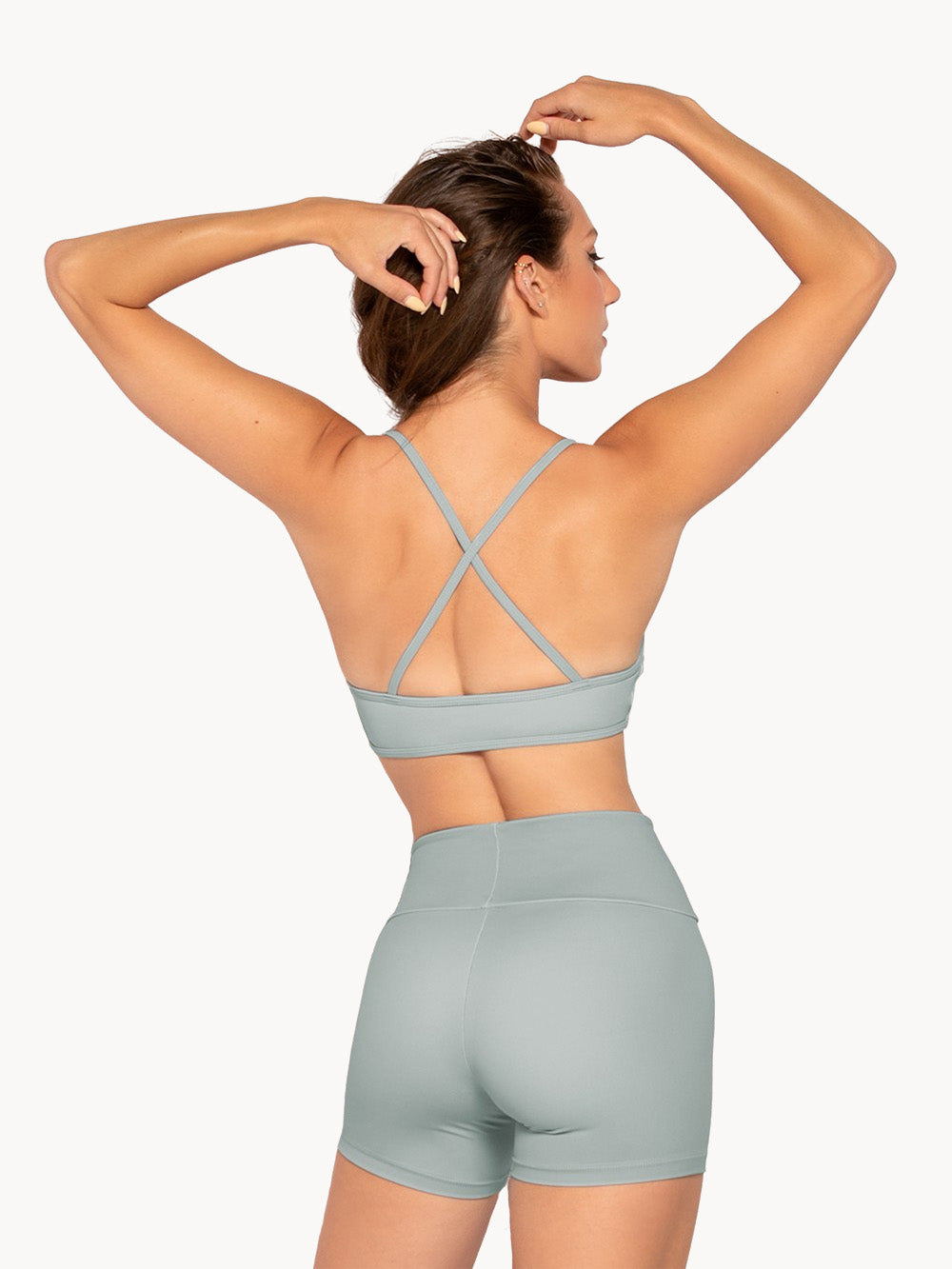 Model is wearing Claire Shorts 4.5" Soft Misty Blue with Nadine Crop Top Devoted Seascape RTW and Rachel Crop Top Soft Misty Blue RTW in size Small.