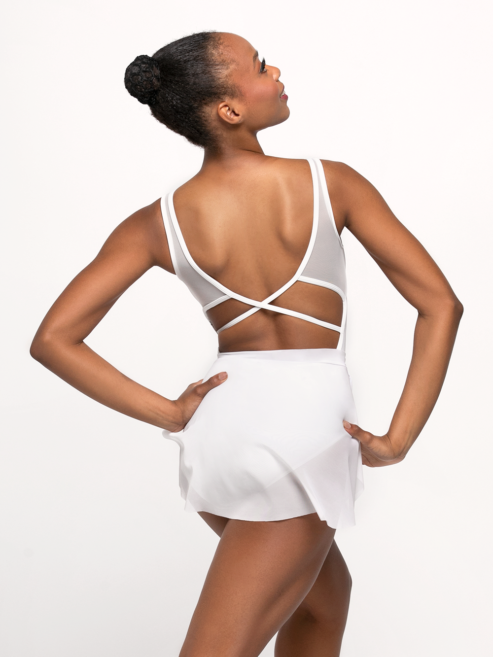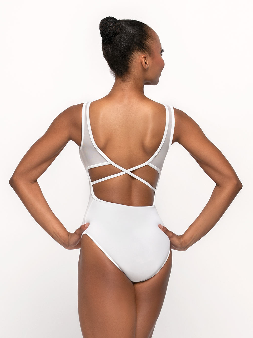 The Fabiola in our softest white is an unexpectedly delightful design for this sweet style. Featuring a pinch neckline and open, strappy back, the Fabiola is perfect for the classroom and the studio.