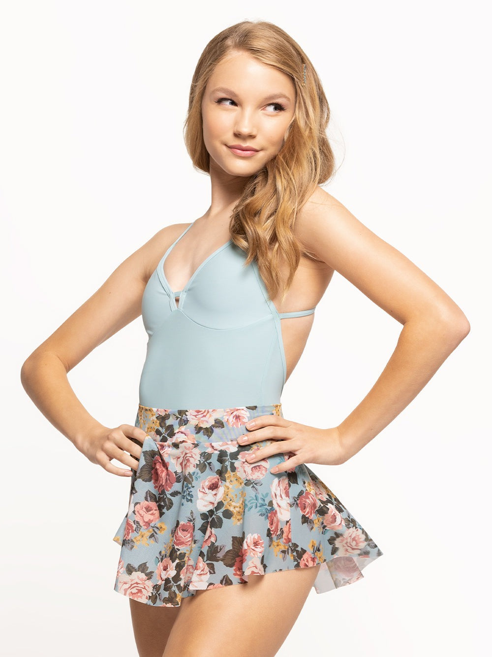 Our Hipster skirt has a fuller, low rise silhouette with a wide waistband that will add movement to any performance piece. Now available in our Rhapsody Misty Blue Mesh.