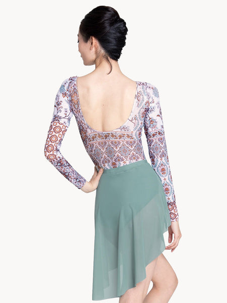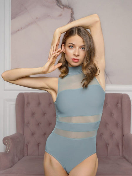 Our summer styles showcase soft pastels with the Kerry Sea Glass. This leotard features a Sea Glass base with subtle Moonstone Mesh Deep V-Panel and T-Back. Finish the look with our Asymmetrical Short Skirt Moonstone!
