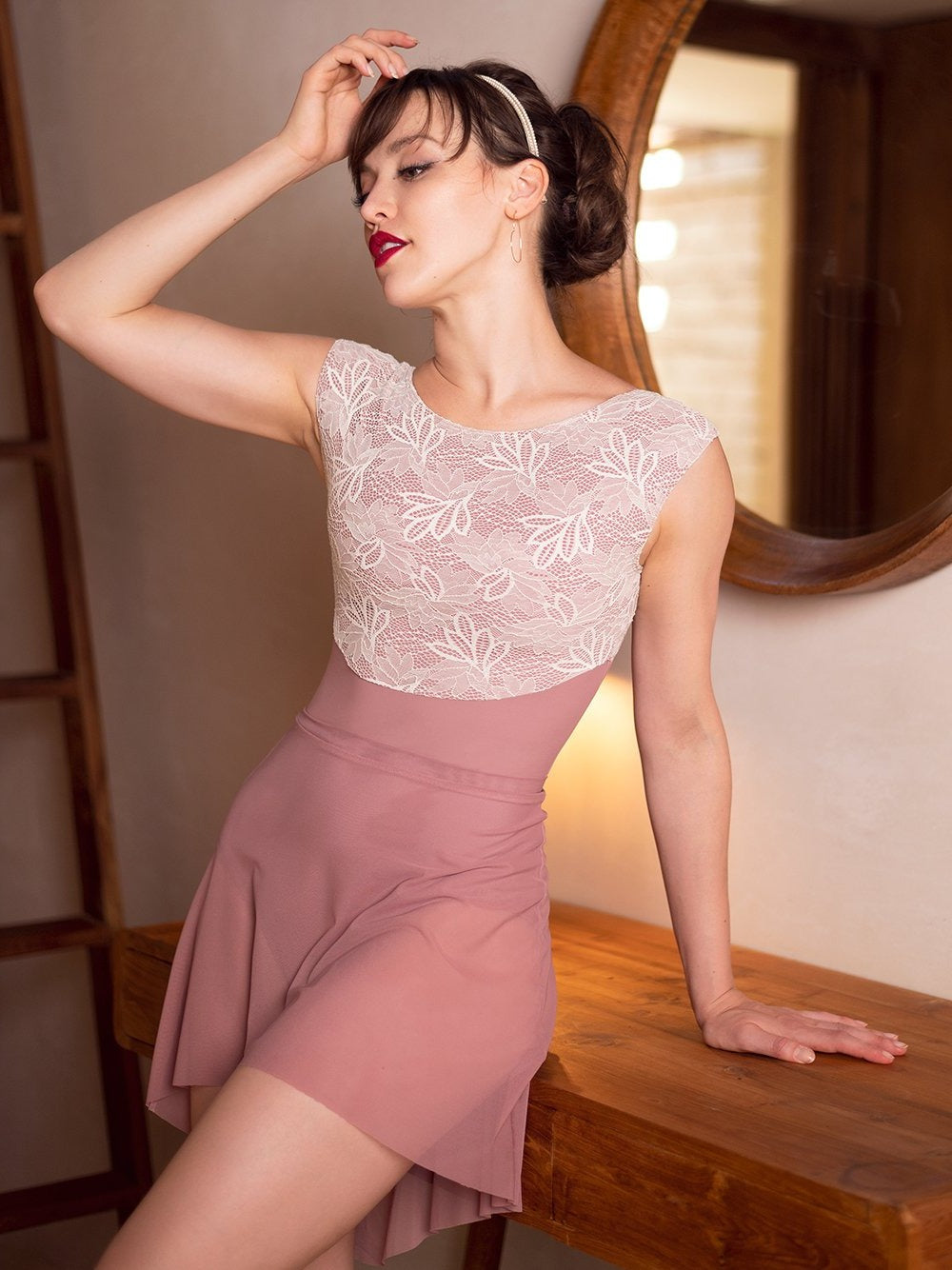 Romanticize yourself in euphoria with the Lilli Lotus Lace leotard! The elegant design of the Ivory Lotus lace combined with the rich color of Quartz is truly your fantasy. This Lilli is certain to become an enduring dance bag favorite. Shown paired with the Mid High-Low Skirt in Quartz Mesh RTW and Veranda Barrier Face Mask RTW.