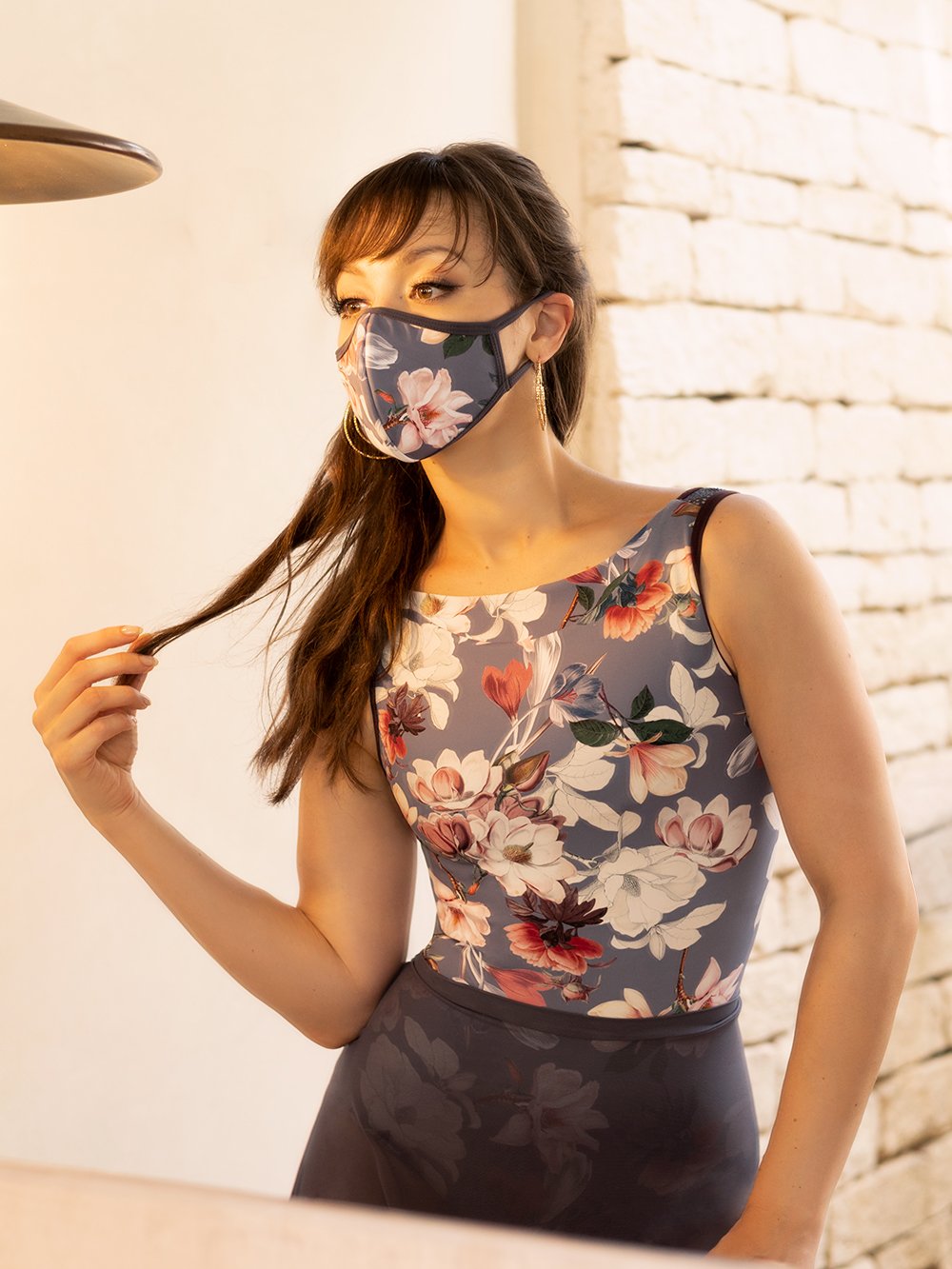 Model is wearing the Louise Sugar Plum RTW leotard with the Short Gathered Skirt Sangria Mesh RTW, Mid High-Low Skirt Plum Lace RTW, and Peacock Skirt Plum Mesh RTW with matching Sugar Plum Barrier Face Mask RTW, sold separately.