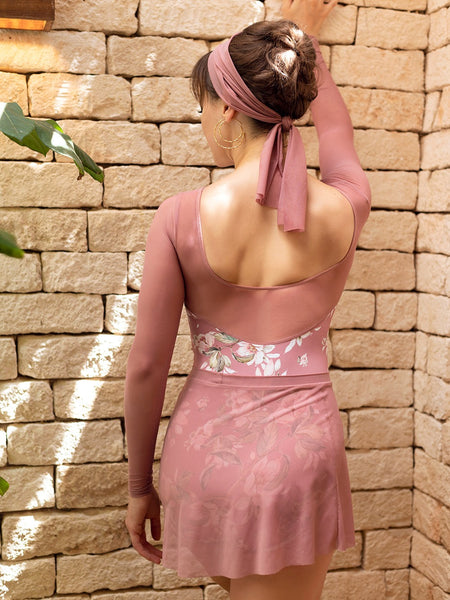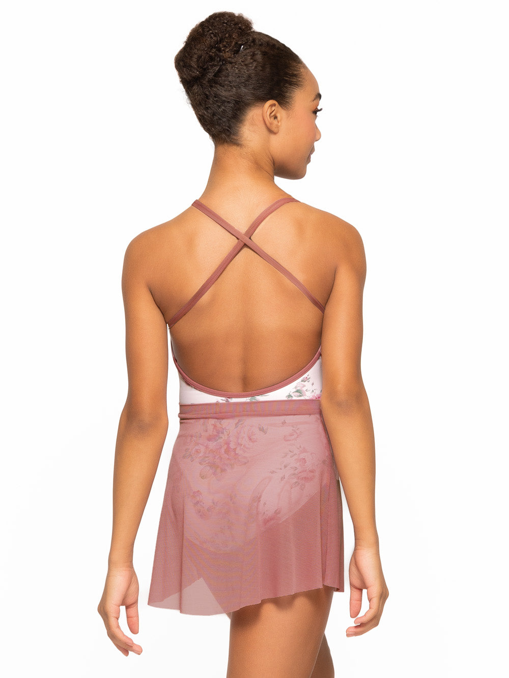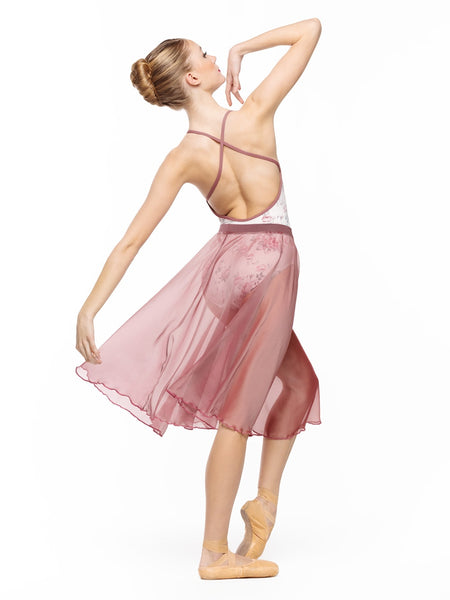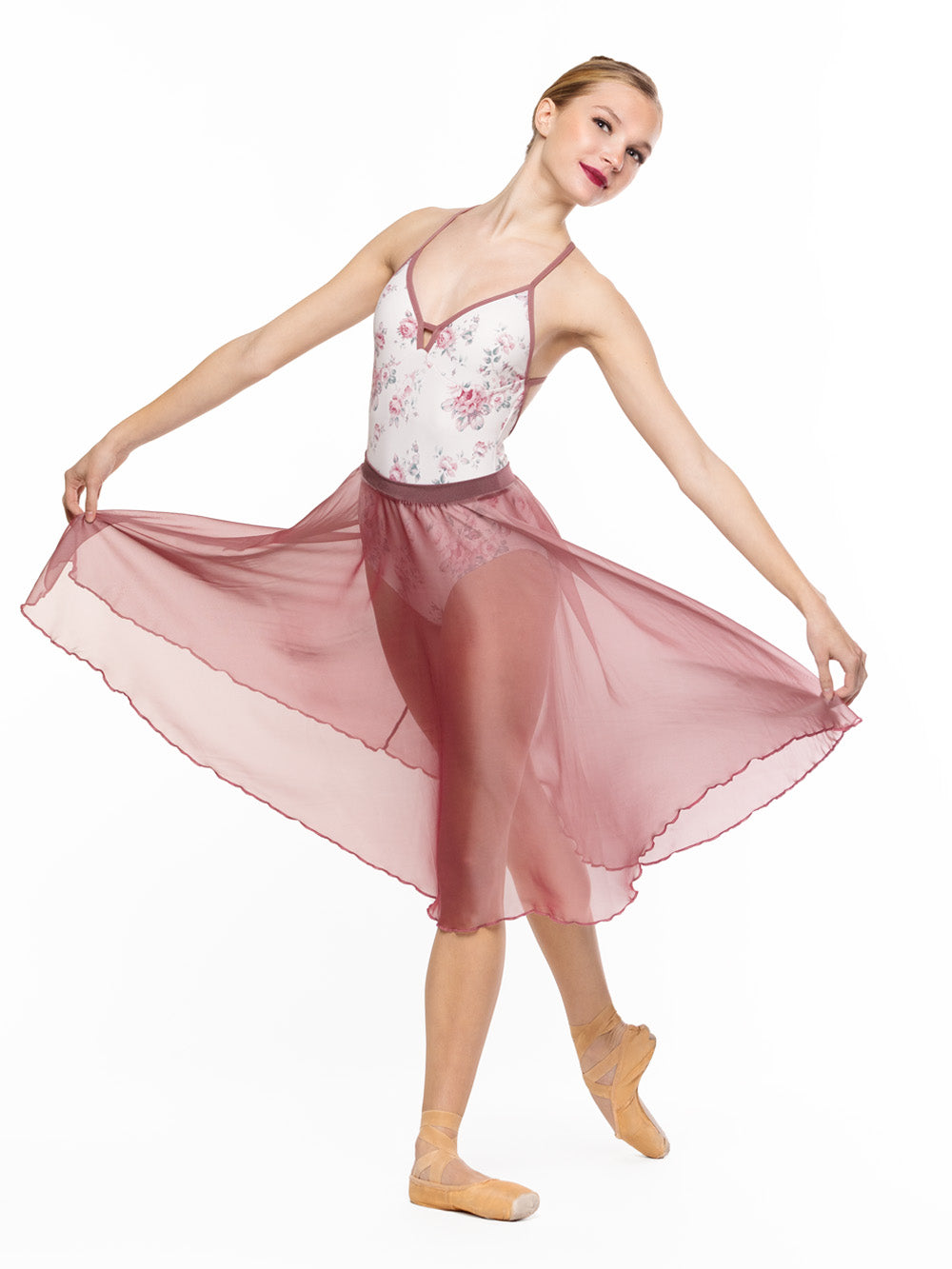 Model 1 is wearing leotard and Chiffon Rehearsal Mink skirt in size Adult XS.