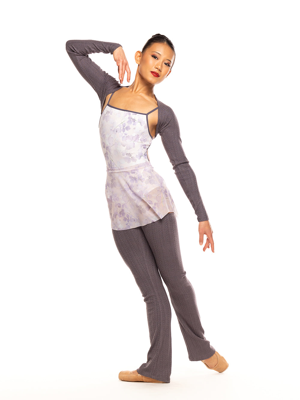Model 2 is wearing skirt and leotard in adult size S, and shrug, ankle warmers, and thigh high leg Warmers in adult size XS/S.