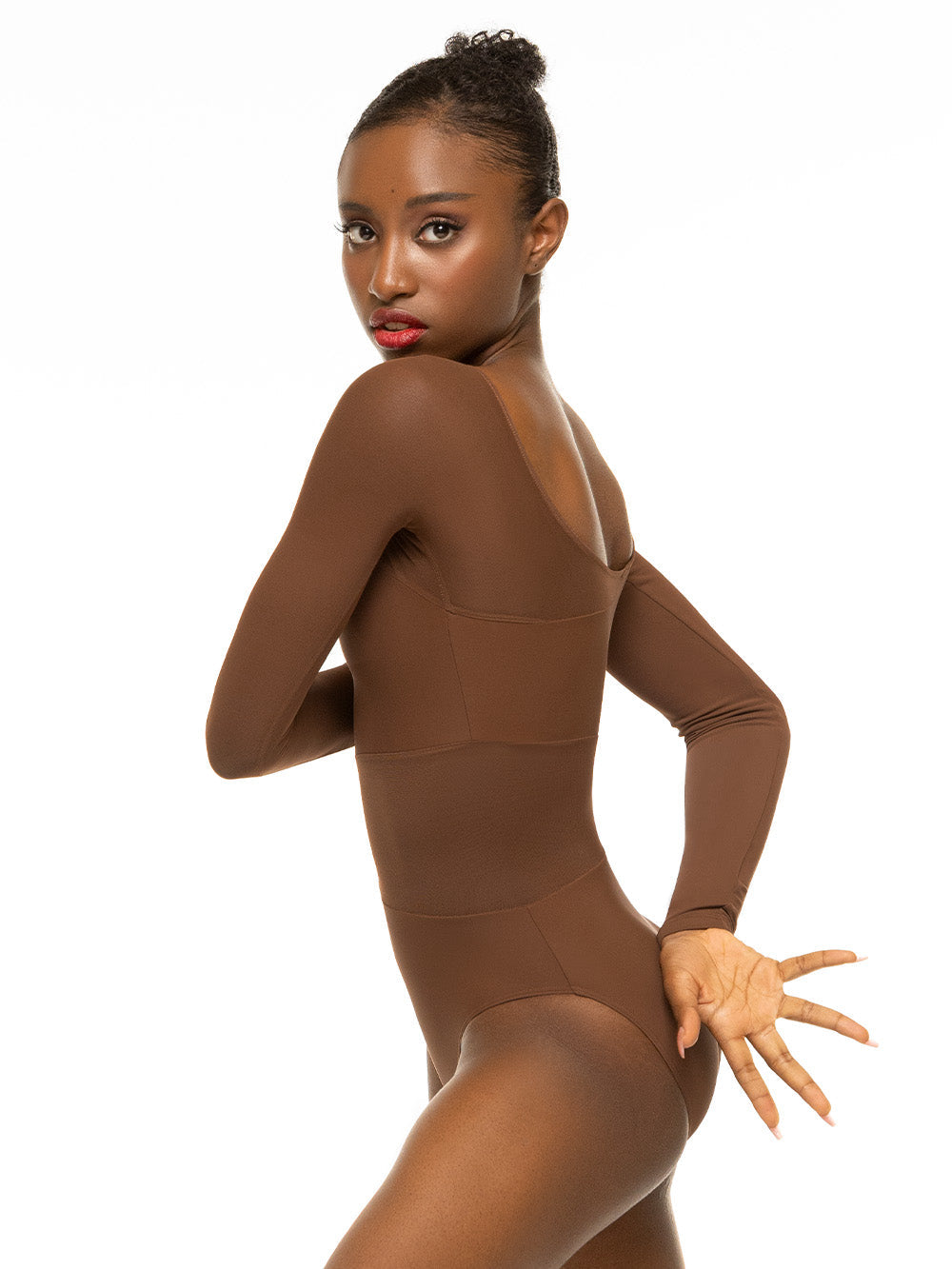 - Model 4 is wearing Amelie Mocha Leotard RTW in size Adult Medium.