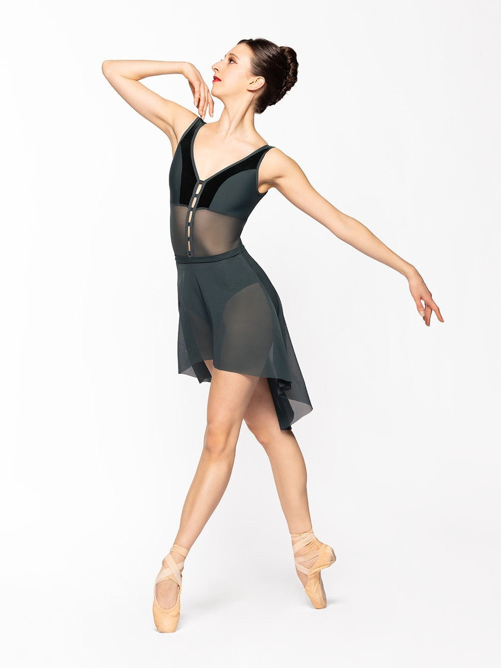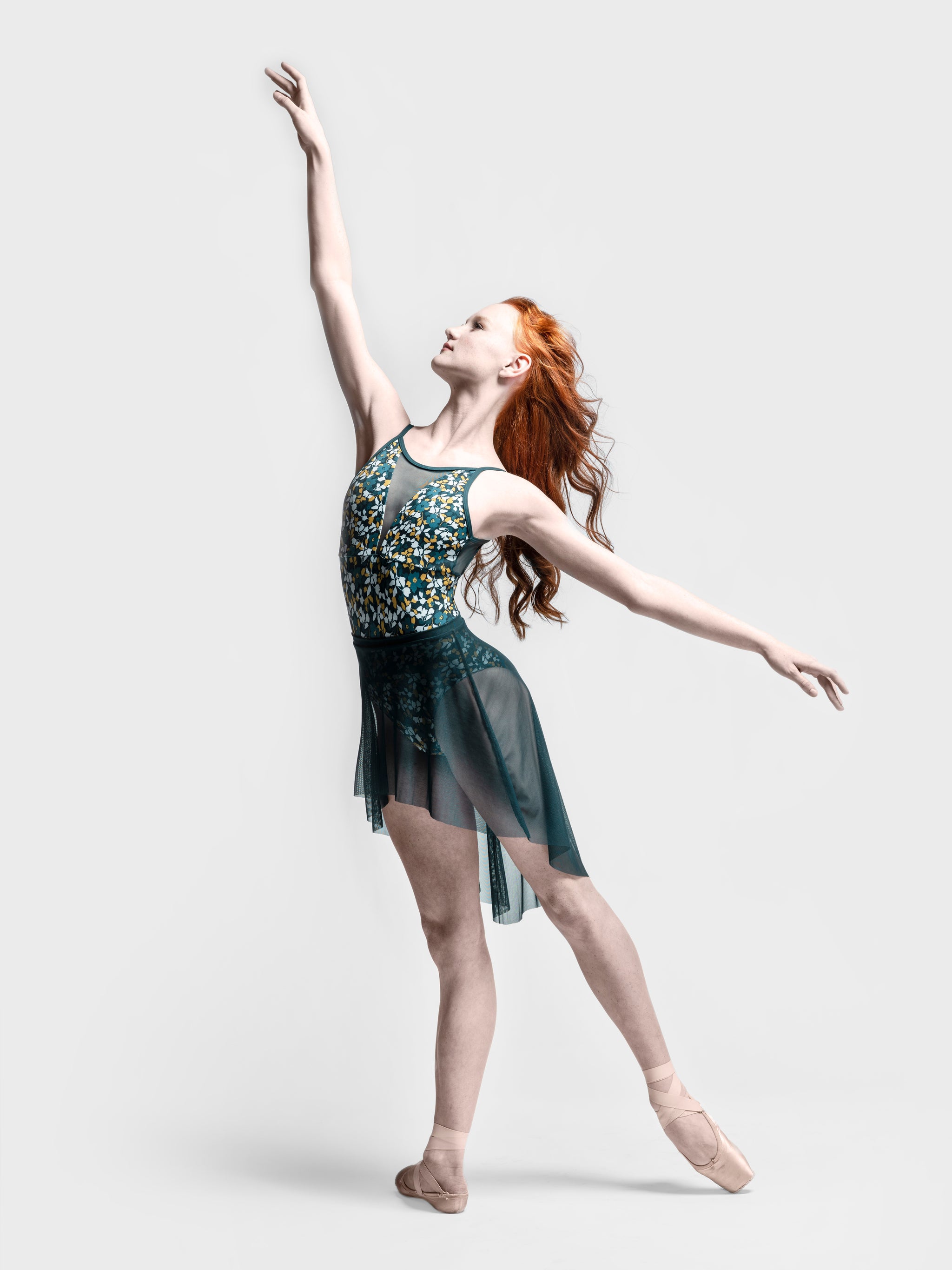 Model 7 is wearing a Brooke Leotard in Golden Ivy and Dark Forest.
